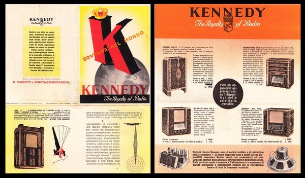 pieghevole di 8 facciate ill. a col. della radio Kennedy di M. Capriotti di Genova; sono rappresentati i seguenti modelli di radio: 306k - f, 306 k, 406k, 705k e 406 k - f; ottimo es.