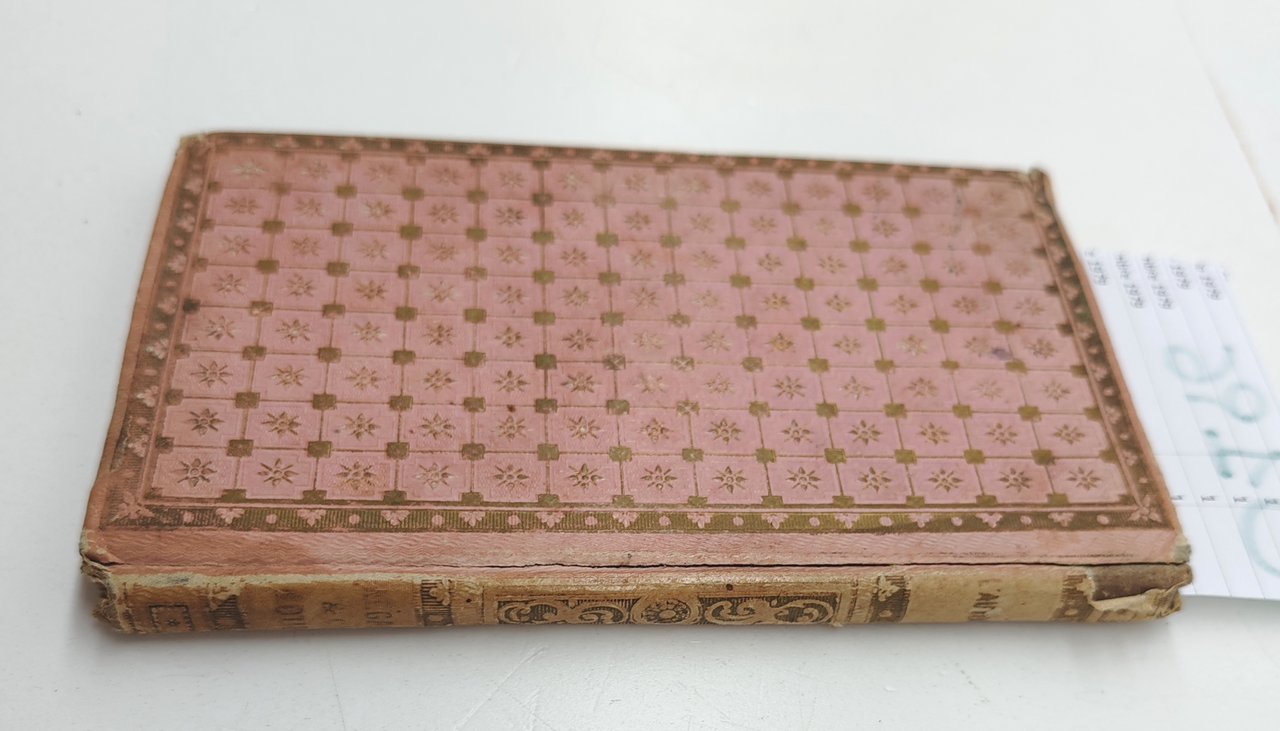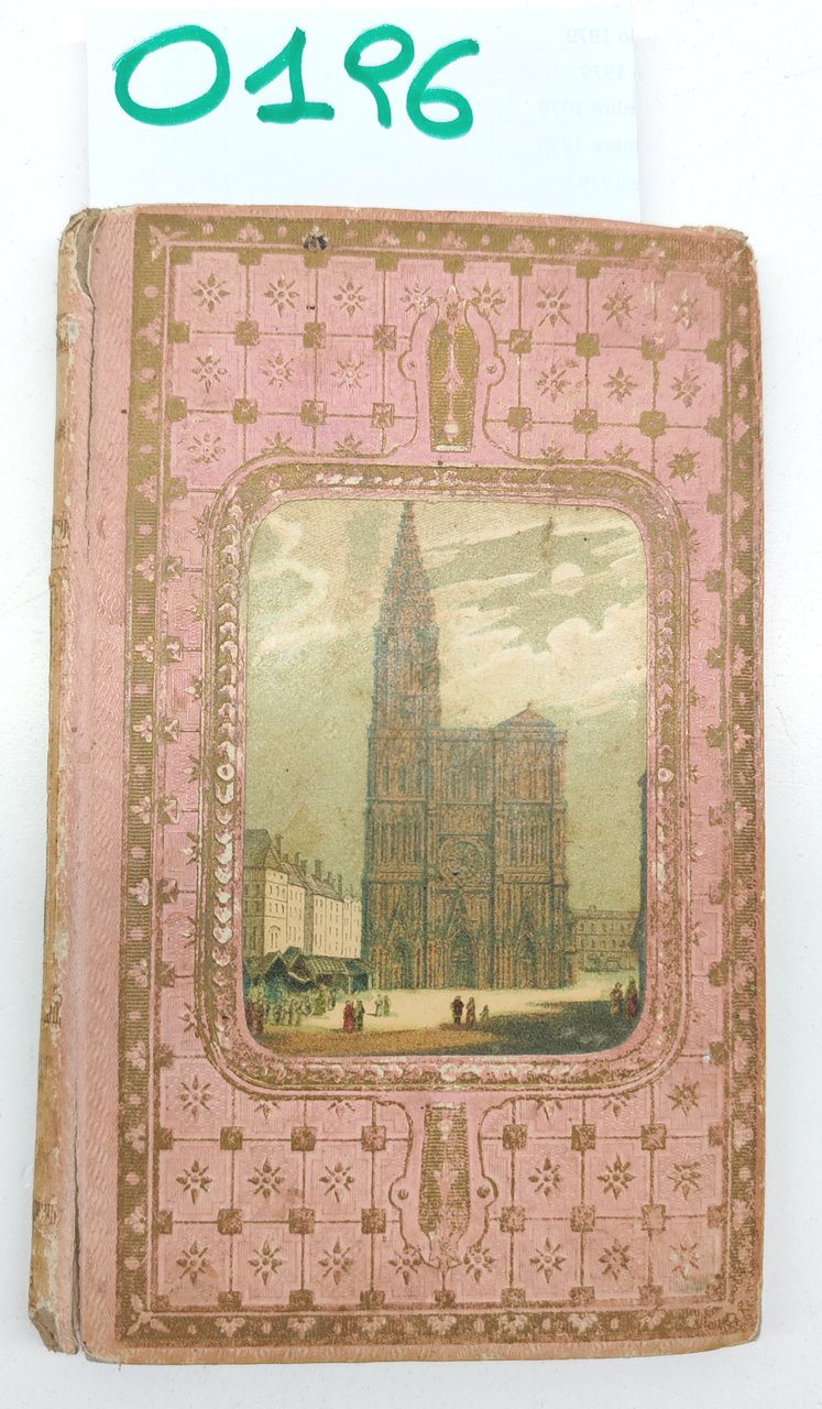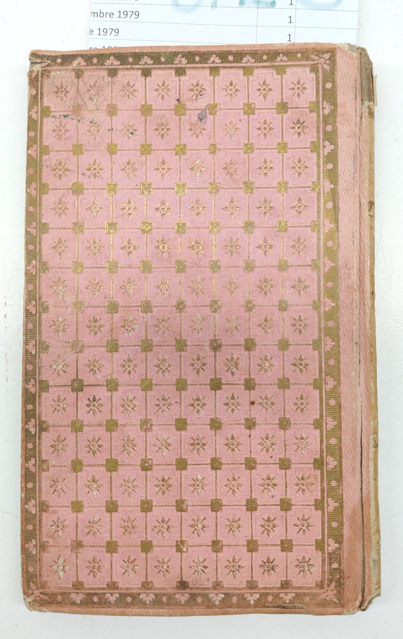 Legatura rigida editoriale in pelle con piatti e dorso decorati e con immagine applicata al piatto anteriore, segni del tempo, abrasioni ai margini e alcune sporcizie, tagli leggermente bruniti con fioriture, alla seconda di copertina etichetta con nome della precedente proprietario, tagli irregolari, antiporta con incisione, fioriture e lievi sporcizie alle pagine interne che non impediscono la lettura, in francese, numero pagine 94 + indice dimensioni cm 14,8 * 9,3