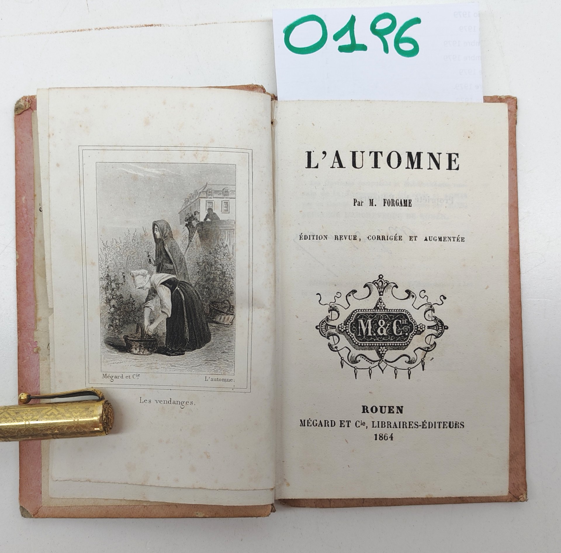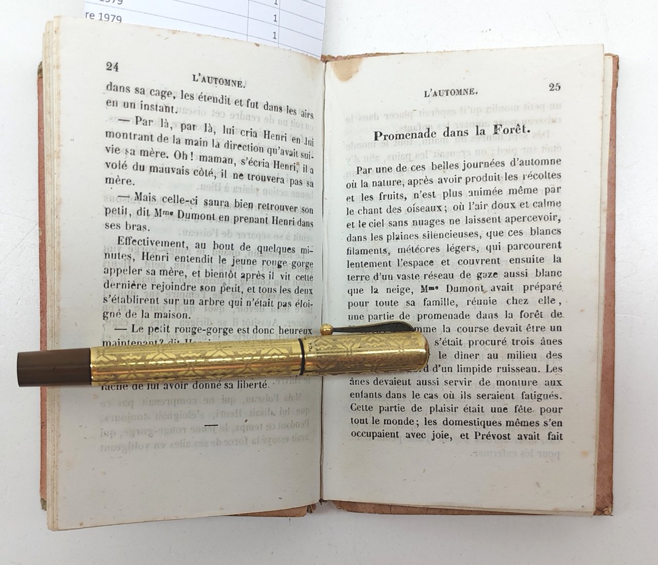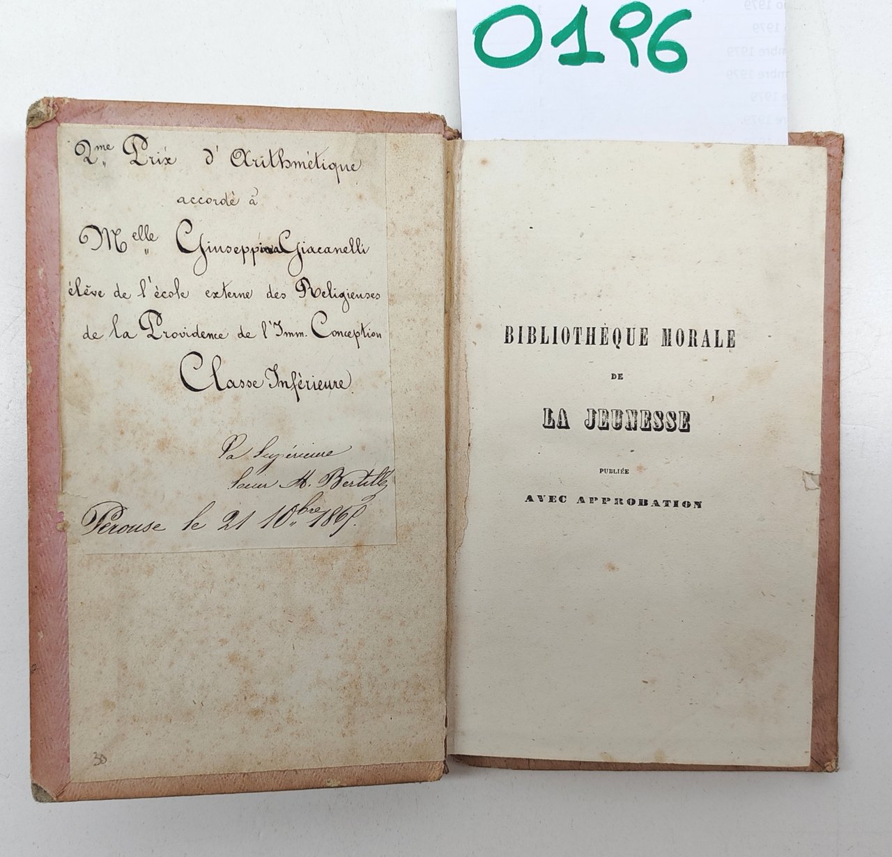 Legatura rigida editoriale in pelle con piatti e dorso decorati e con immagine applicata al piatto anteriore, segni del tempo, abrasioni ai margini e alcune sporcizie, tagli leggermente bruniti con fioriture, alla seconda di copertina etichetta con nome della precedente proprietario, tagli irregolari, antiporta con incisione, fioriture e lievi sporcizie alle pagine interne che non impediscono la lettura, in francese, numero pagine 94 + indice dimensioni cm 14,8 * 9,3