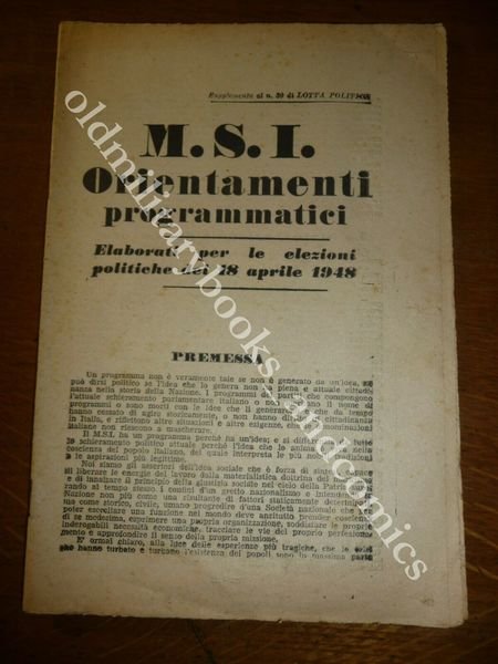 TITOLO: M.S.I. ORIENTAMENTI PROGRAMMATICI ELABORATI PER LE ELEZIONI POLITICHE DEL 18 APRILE 1948 DESCRIZIONE: Supplemento al n. 30 di LOTTA POLITICA S.E.I. Roma s.d. ma 1948, br. spillata, pp. 16 in 16°. Gli orientamenti del M.S.I. nella prima partecipazione alle elezioni politiche del dopoguerra. CONDIZIONI: Ottime. PESO / WEIGHT: 14 gr. without package