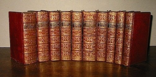 12mo (cm. 11,8), 10 Voll., 12 cc.nn. (compreso frontis. e un ritratto di Cicerone interamente incisi su rame), 768 pp.; 614 pp., 1 c.nn. bianca; 550 pp., 1 c.nn.; 560 pp.; 8 cc.nn., 506 pp., 1 c.nn. bianca; 6 cc.nn., 685 pp., 1 cnn. bianca; 486 pp., 1 c.nn. bianca; 386 pp., 1 c.nn. bianca; 301 pp.; 315 pp., 5 cc.nn. Splendide legature coeve in marocchino rosso con nervi, ricchissimi fregi e titolo in oro su tassello nero al ds. Piatti incorniciati da duplici fili oro. Dentelle decorate. Tagli oro. Carte di guardia marmorizzate con disegno a pettine. Alcune cuffie leggermente danneggiate, qualche piccolo taglio alle cerniere e poche insignificanti abrasioni ai piatti. Nel complesso esemplare in bellissimo stato di conservazione. Willems, n. 535: ‘Cette édition. est très jolie et fort recherchée’. Provenienza: collezione Wardington (Ex libris cartaceo ai contropiatti posteriori).