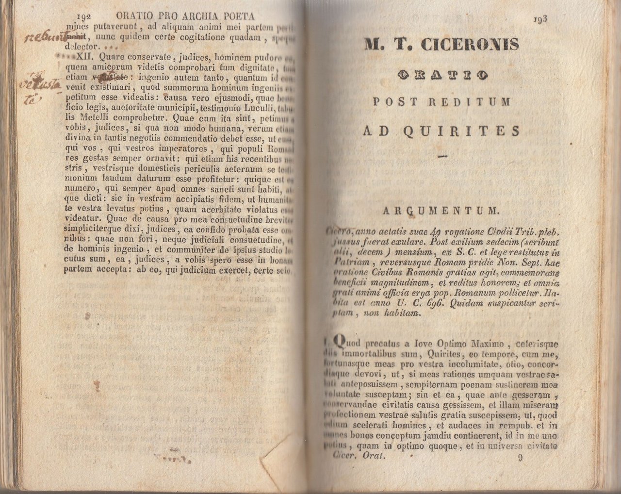 copertina coeva in cartone rigido con fettuccia di rinforzo al dorso. stato di conservazione: molto buono (fioriture, copertina un po' sciupata)Libro antico orazioni scelte di Cicerone in latino