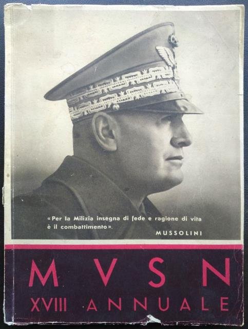 A cura dell'Ufficio Storico della M. U. S. N. (Ufficio Storico della Milizia) - Scalia Editore, Roma, 1940. Stampato in Roma per il XVIII Annuale della M. U. S. N. con i Tipi dello Stabilimento Grafico Tiberino. In 4to, pp. 98 circa non num., ricchissimo di ill. fot. in b/n, tutte a grandi figure, cronistoria eloquente del regime; le foto sono suddivise per diversi argomenti: Albo di Gloria, Le Medaglie d'Oro, Mussoliniana, Vita della Milizia, Eroica e Nostra Famiglia; accompagnano le numerose foto alcune splendide tavole, a col. o virate al seppia, queste ultime stampate su carta più spessa e con la figura del Duce, bross. edit. in carta con bellissimi colori viola / fuxia e il ritratto fot. di Mussolini. La Milizia Volontaria per la Sicurezza Nazionale (acronimo M. U. S.N.), più nota come “camice nere, per il colore nero della divisa, fu un corpo di gendarmeria a ordinamento militare e dal 1924 una forza armata dell'Italia fascista. La sua fondazione fu decisa e annunciata dal Consiglio dei Ministri, presieduto da Mussolini, il 28 dicembre 1922 e decretata dal re Vittorio Emanuele III, con regio decreto del 14 gennaio 1923. Inizialmente pensata a uso esclusivo del Partito Nazionale Fascista, accorpò la vecchia e disciolta milizia e nel tempo finì col mescolarsi quasi del tutto con il regio esercito. Raro e bel volume di grandi dimensioni che racconta, attraverso i testi e le immagini, la storia della Milizia Volontaria per la Sicurezza Nazionale nell'anno 1940, anno cruciale per la storia d'Italia. Le immagini sono tra le piu' belle scattate nel periodo, visto che l'Annuario rappresentava il miglior compendio possibile realizzato dall'Ufficio Storico della Milizia. Tranne una sciupatura al margine inferiore di copertina e altri minimi difetti al dorso, ottima conservazione.