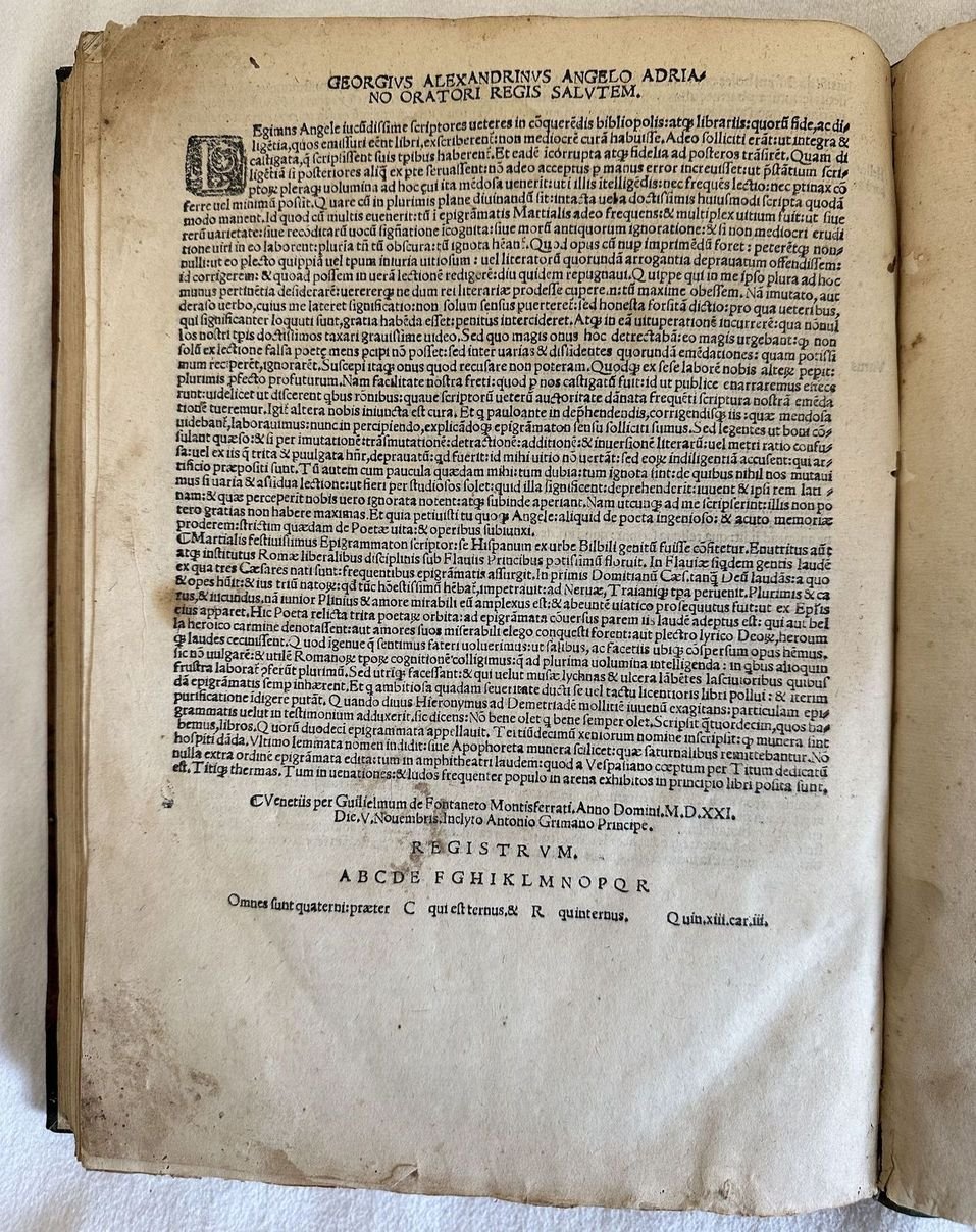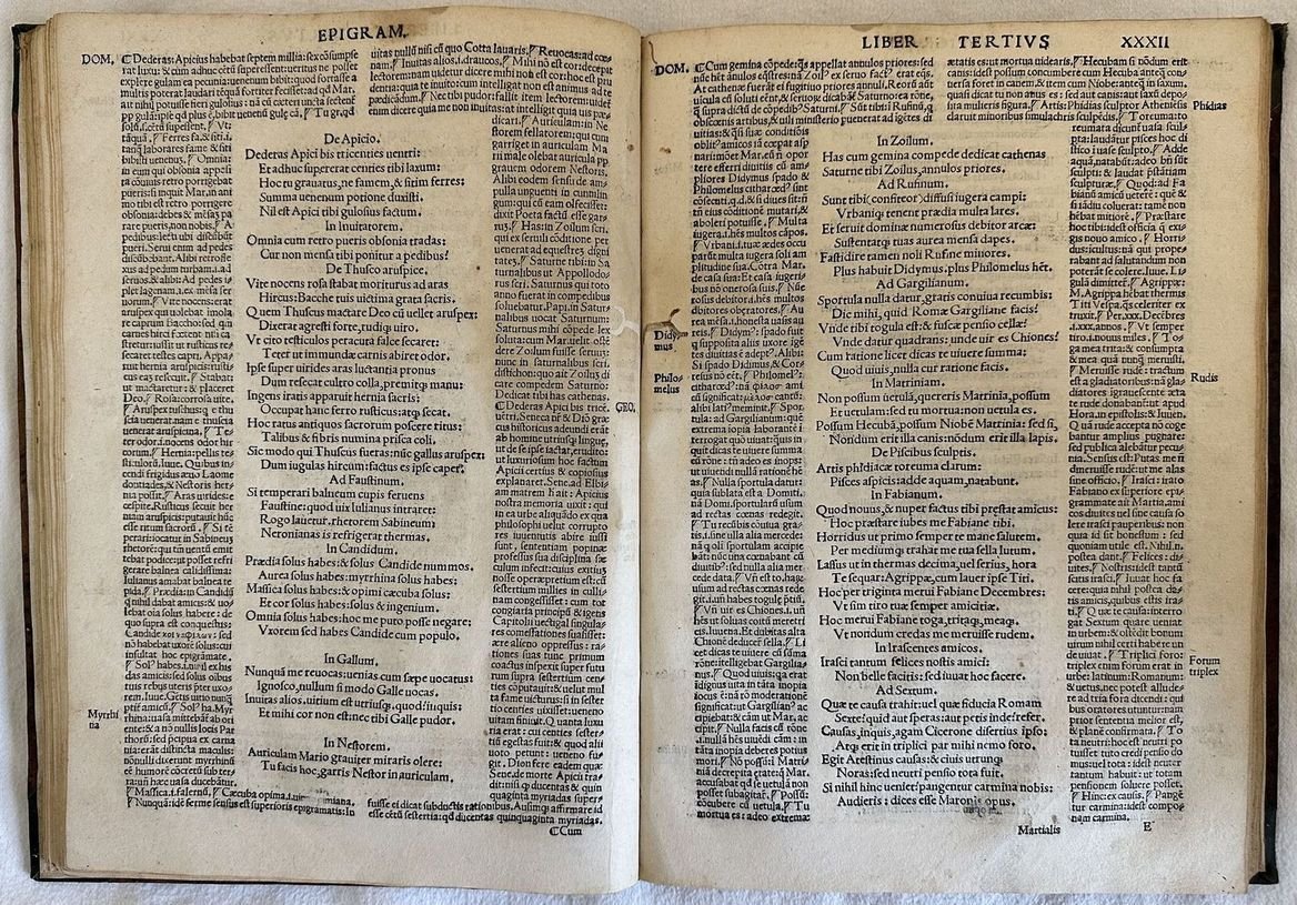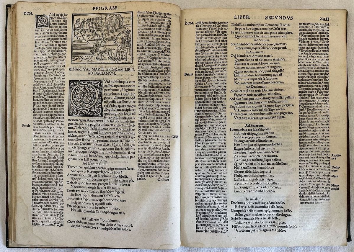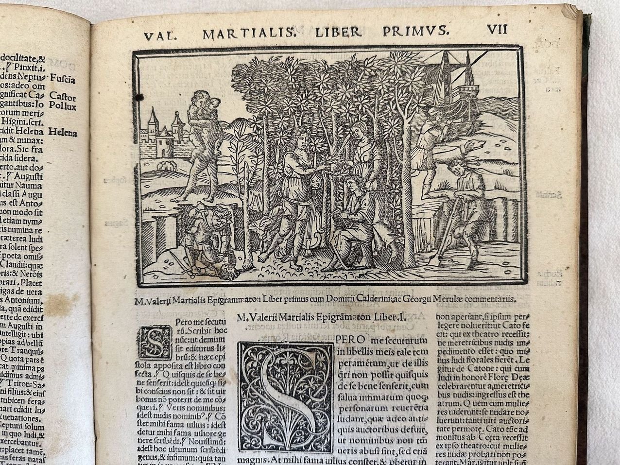 Bella edizione illustrata del 1521 della celebre opera Epigrammata scritta da Marco Valerio Marziale il più importante epigrammista. L’indicazione dello stampatore e data di stampa al colophon. Stile gotico e caratteri romani. Testo con commento incorniciato dal commento del letterato umanista Domizio Calderini (Torri del Benaco 1446-Roma1478)amico del Cardinal Breessarione, segretario apostolico in relazione con Poliziano e Lorenzo de Medici, morto di peste a Roma e dell'umanista Giorgio Merula (Alessandria c. 1430-Milano 1494). Testo a doppia colonna e numerazione singola in numeri romani. Bellissimo frontespizio roso e nero entro cornice con elementi floreali stilizzati. Al centro vignetta con disegno di un forte.ì All’interno 16 piccole xilografie finemente incise. Antica firma al frontespizio e antiche note manoscritte nel testo. Collazionato e completo. Copertina in mezza pelle ottocentesca con titolo e decorazioni in oro al dorso in buone condizioni con lievi usure marginali. Legatura in buone condizioni. Pagine in buone condizioni generali con fioriture e lievi gore d’umidità marginali. Parti mancanti al frontespizio. Piccolo segno di tarlo al margine superiore da pag. XXXVI alla fine senza perdita di testo. In folio. Dim. 30x21,5 cm. Pp. (4)+CXXXVI+(1).Beautiful illustrated edition of 1521 of the famous work Epigrammata written by Marco Valerio Marziale. Indication of publisher and date in colophon. Gothic style and roman carachters. Text with comment framed by the letetrate and humanist Domizio Calderini (Torri del Benaco 1446-Roma1478) friend of Cardinal Breessarione, and the letterate Giorgio Merula (Alessandria c. 1430-Milano 1494). Text in double column and single numbering. Inside 16 little woodcuts finely engraved. Antique signature in the title page and different antique handwritten notes in the text Collationed and complete. Half leather cover of 19th century with gilted title in the spine in good conditions lightly worn in the extremities. Binding in good conditons. Pages in good conditions with foxing and light dump stains in the edges. Lackings in the title page. Little worming in the upepr edge from pag. XXXVI to the end with no loss of text. In folio. Dim. 30x21,5 cm. Pp. (4)+CXXXVI+(1).
