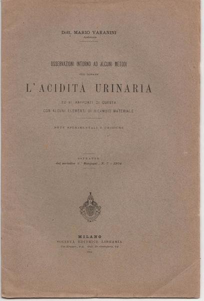 M. VARANINI METODI PER DOSARE L'ACIDITA' URINARIA ESTRATTO DA MORGAGNI N. 7 1904 SOC. ED. LIBRARIA 1904 L5572 COPERTINA MORBIDA EDITORIALE CON UNA PIEGA ALL'ANGOLO INFERIORE LIEVI SEGNI DEL TEMPO, ALCUNE FIORITURE INTERNE A FOGLI CHIUSI, N. PAG. 20 CM. 25 X 16,5