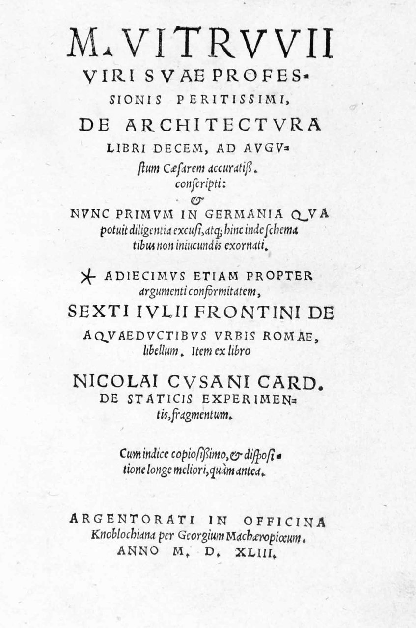 M. VITRUVII VIRI SUAE PROFESSIONIS PERITISSIMI, DE ARCHITECTURA LIBRI DECEM, AD AUGUSTUM CAESAREM ACCURATISS. CONSCRIPTI. - & nunc primum in Germania qua potuit diligentia excusi, atque hinc inde schematibus non iniucundis exornati....