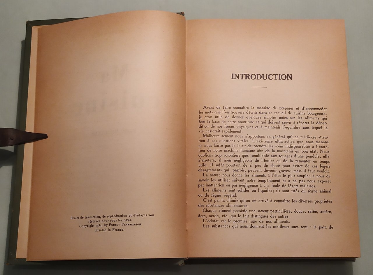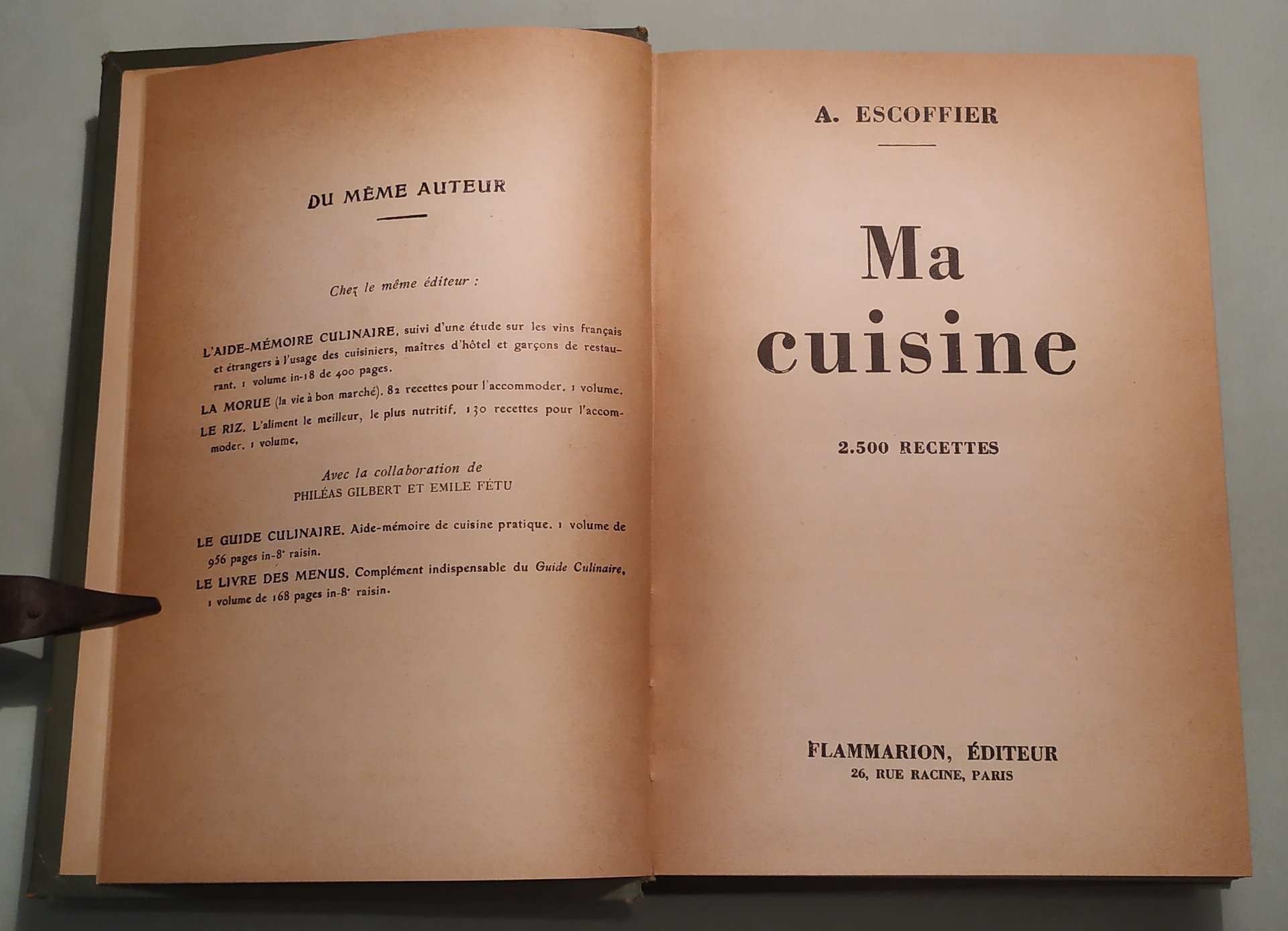 Paris, Flammarion, 1934. In fine Emm. Grevin et fils, Imprimerie de Lagny, 5-1955. In 8vo; pp.703, 1n.n. Tela editoriale verde, titolo in oro al piatto anteriore ed al dorso. Bitting, pag.146: “At head of title: A. Escoffier. The Library of Congress has listed this as André Escoffier”.