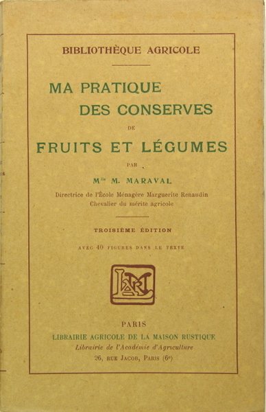 Librairie agricole de la Maison Rustique, Paris, s.d. (début 20è). In/8 broché, couverture imprimée, 40 illustrations in-texte, 244 p., troisième édition. Ouvrage en excellent état.Conservation par la chaleur en vase clos (appert), par la chaleur en récipients non hermétiquement clos, conservation par le froid, conservation à l’abri des variations de température, par la dessiccation, par enrobage, par le sel, le vinaigre, l’alcool, recettes d’entremets, desserts, liqueurs.
