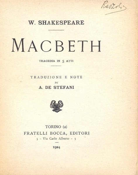 Macbeth. Tragedia in 5 atti. Traduzione e note di De Stefani.