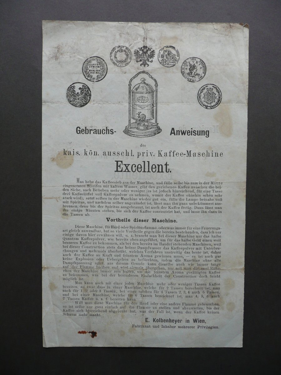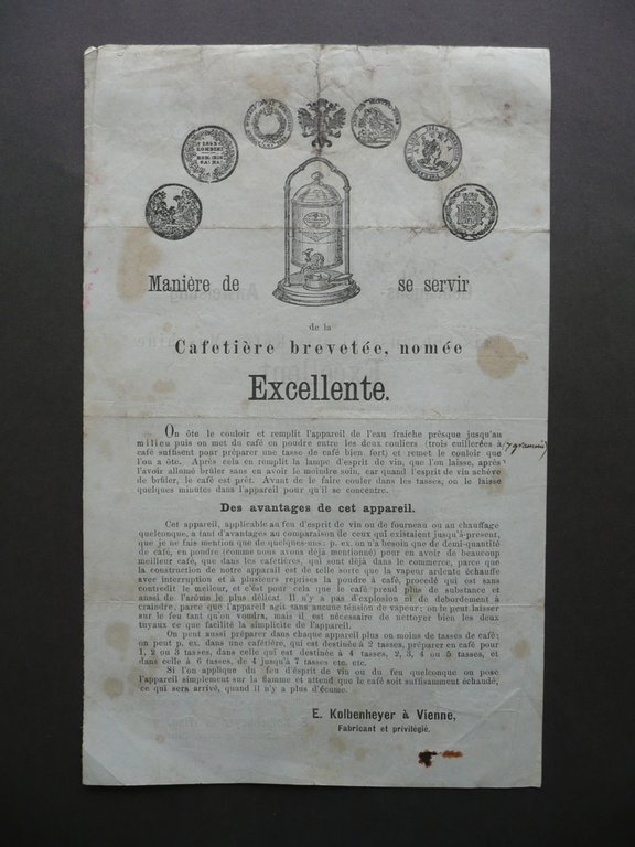 Foglio pubblicitario, Manière de se servir de la Cafetière brevetée, nomée Excellente - E. Kolbenheyer à Vienne Fabricant et privilégié S.d. (1870), foglio pubblicitario a stampa su carta, margine sup. con piccola ill. in b/n della macchina da caffè reclamizzata e piccole ill. in b/n dei premi ricevuti alle varie esposizioni. Testo bilingue fronte / retro (francese e tedesco). Cm 24,5x15. Condizioni di conservazione Esemplare complessivamente in buono stato con tracce d'uso, pieghe di conservazione, qualche lieve alone e leggerissime tracce di sporoco, angoli con lievi tracce di pieghette, margine sup. con un paio di minimi strappetti, margine inf. con una piccolissima mancanza. Foglio pubblicitario bilingue fronte / retro (francese e tedesco). Mancanza della data, ma dai premi ricevuti alle esposizioni si può approssimare al 1870 circa. SC03.D9877 N