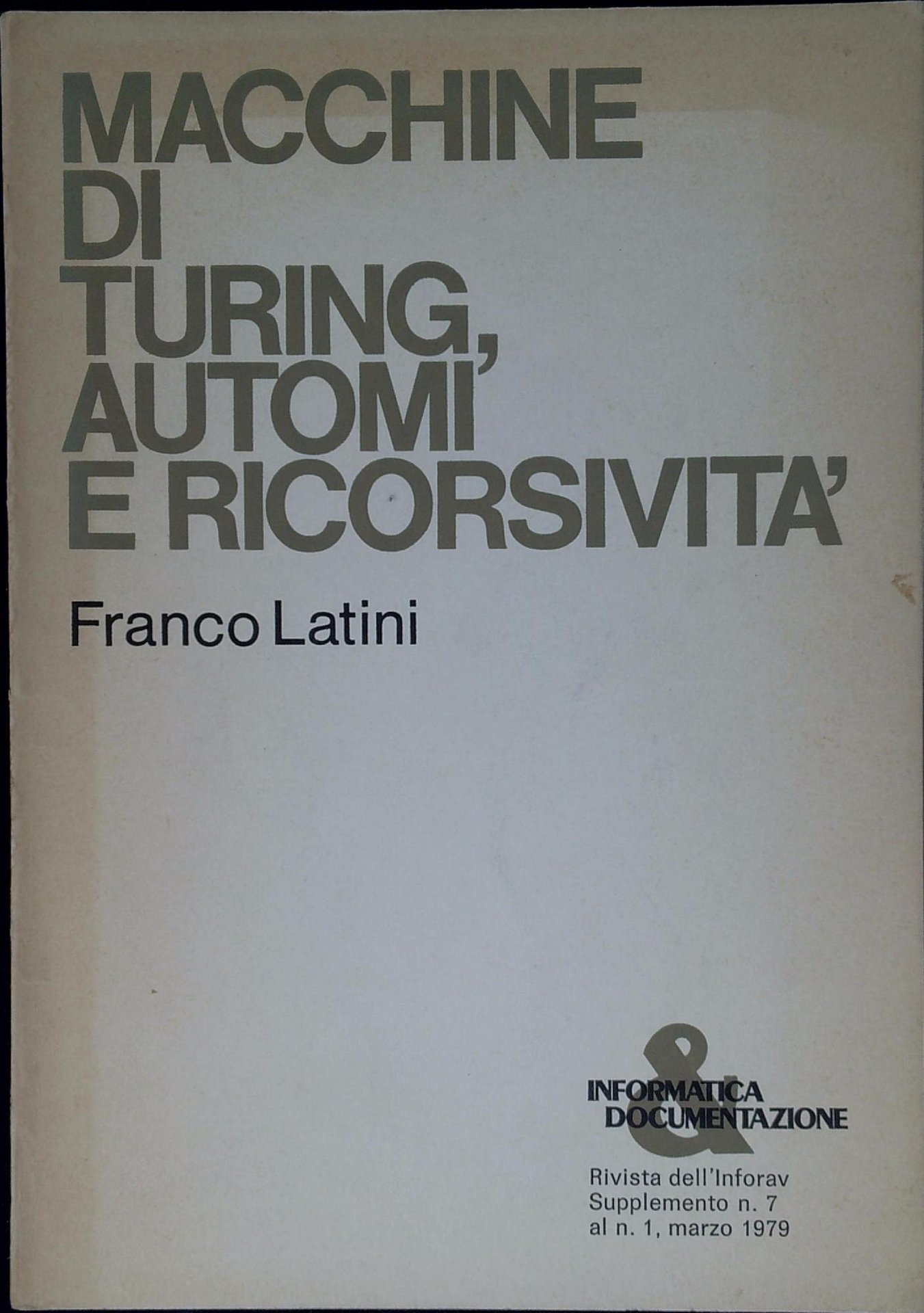 Latini, Franco Macchine di Turing, automi e ricorsività. Roma, Inforav 1979, 54 p. ; 24 cm. (39559)