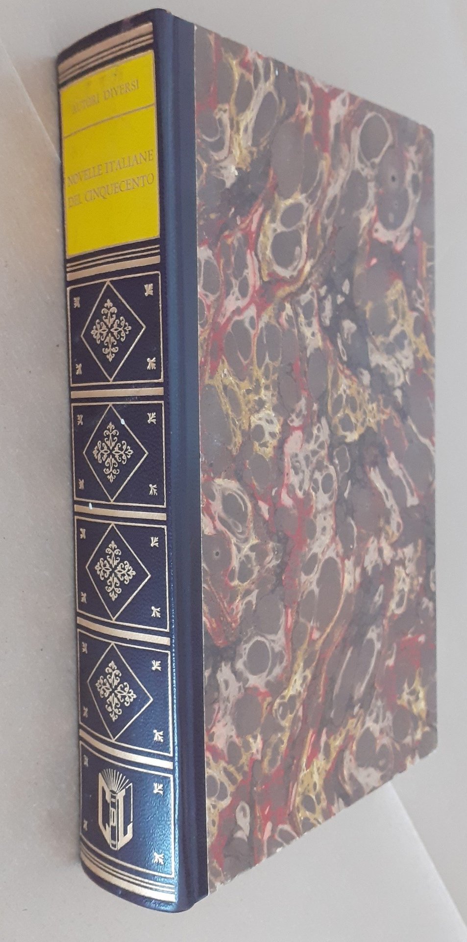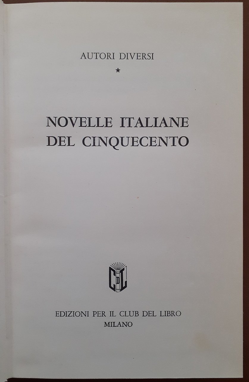 Machiavelli et al., Novelle italiane del Cinquecento, a cura di Bruno Maier, Edizioni per il Club del Libro, Milano 1962, pp. XLIV, 479, cm 22, legatura in mezza similpelle ed. con titoli e fregi al dorso e piatti in carta marmorizzata. Collana dei classici, vol. 8. Esemplare n. A0514. Indice: Il mito letterario di un nuovo Decameron e la novellistica italiana del Cinquecento – Bibliografia – Niccolò Machiavelli (Nota biografica e bibliografica – Belfagor arcidiavolo) – Baldesar Castiglione (Nota biografica e bibliografica – Le parole congelate – La scimmia giocatrice di scacchi – Il giocatore di carte blasfemo – Il Bibbiena al carnevale di Roma) – Luigi Da Porto (Nota biografica e bibliografica – Giulietta e Romeo) – Matteo Bandello (Nota biografica e bibliografica – La beffa e il cambio – La contessa di Challant – La confessione sacrilega – Giulia da Gazuolo – Messer Cocco e Domicilia – La Parisina – La confutazione scaltra – I bei motti e le pronte risposte – Il drappiere di Lione) – Pietro Aretino (Nota biografica e bibliogarfica – Novelletta dei giocatori al buio – I due doni offerti a un principe indiano) – Agnolo Fiorenzuola (Nota biografica e bibliografica – Dai Ragionamenti. I – Dai ragionamenti. II – Da La prima vera dei discorsi degli animali) – Giovan Francesco Straparola (Nota biografica e bibliografica – L’asino Brancaleone – Il testamento d’Andrighetto – Novella del frate mangione) – Pietro Fortini (Nota biografica e bibliografica – Da Le giornate delle novelle dei novizi –Dalle Novelle de le piacevoli ed amorose notti de’ novizi) – Anton Francesco Grazzini, il Lasca (Nota biografica e bibliografica – La punizione esemplare – Il pescatore astuto – Le tragicomiche vicende di Falananna – Tragici amori di Tiberia e di Sergio) – Giambattista Giraldi Cintio (Nota biografica e bibliografica – La schiacciata contesa – La tragedia di Orbecche – Il moro di Venezia – Il dottore beffato) – Ortensio Lando (Nota biografica e bibliografica – L’astrologia – La tragedia di Rodi – Il cavaliere cortese) – Anton Francesco Doni (Nota biografica e bibliografica – Da I marmi – Novella della gentildonna) – Gerolamo Parabosco (Nota biografica e bibliografica – Dai Diponti. I – Dai Diponti. II – Dai Diponti. III) – Sebastiano Erizzo (Nota biografica e bibliografica – Da Le sei giornate) – Celio Malespini (Nota biografica e bibliografica – Il negromante). Minime tracce d’uso alla legatura, lievissima brunitura della carta, per il resto ottimo esemplare.