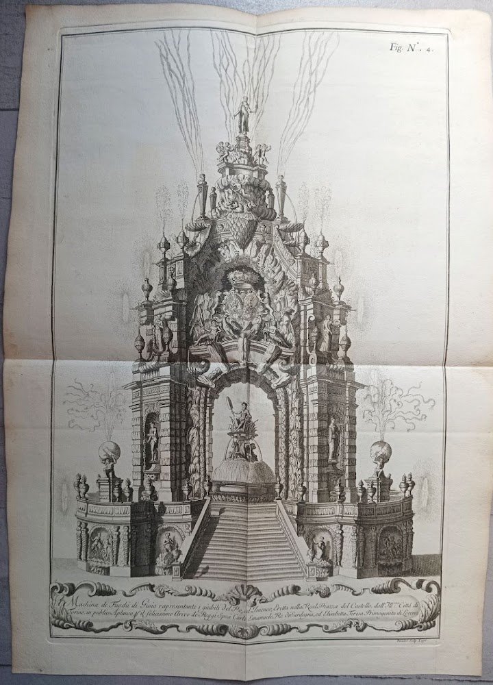>Incisione originale su rame (mm 600x390 dalla battuta). Lungo il lato inferiore, dentro un cartiglio, il titolo: "Machina de Fuochi di Gioia rapresentante i giubili del Po, ed Imeneo, Eretta nella Reale Piazza del Castello, dall'Ill.ma Città di | Torino, in publico Aplauso pr. il felicissimo Arivo de Reggi Sposi Carlo Emanuele Re di Sardegna, ed Elisabetta Teresa primogenita di Lorena". In basso a destra: Daudet Sculp. Ludg.. In alto, a destra, l'indicazione: Fig. N. 4. Tratta dall'opera: “La sontuosa illuminazione della città di Torino”, pubblicata per l'augusto sposalizio delle Reali Maestà di Carlo Emmanuele Re di Sardegna e della principessa Elisabetta Teresa, che raccoglie 14 tavole a doppia pagina, disegnate e inc. in rame da vari artisti (Vittone, Masson, Agliaudi, Daudet, Belmondo, de Prenner, Herriset), raffiguranti stupende vedute di Torino «illuminata». Bell'esemplare.