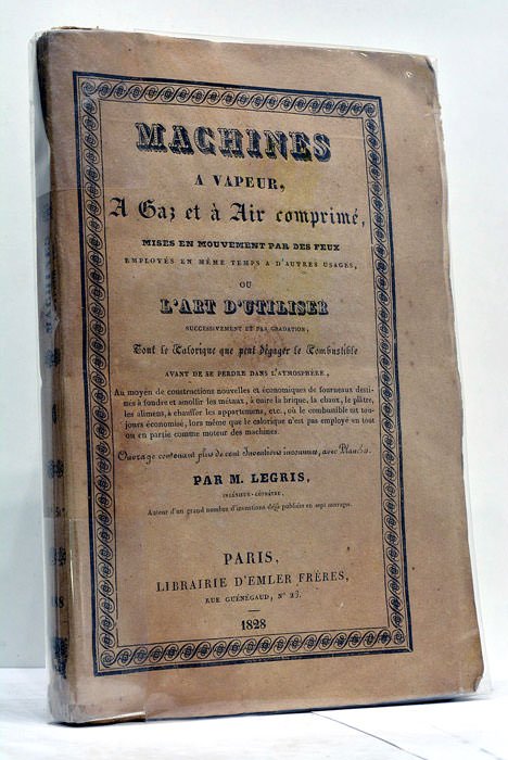2 feuillets. 188 pages. (21x14 Cm). Broché. Couverture imprimée. Cet ouvrage décrit 43 machines et appareils inventés par l'ingénieur français Louis Legris. Plusieurs de ces inventions concernent la cuisine (fours à pain et à pâtisserie, chaudières portatives pour faire cuire les légumes, etc.). 1 grande planche lithographiée. Rousseurs et mouillures prononcés. Papier bruni.