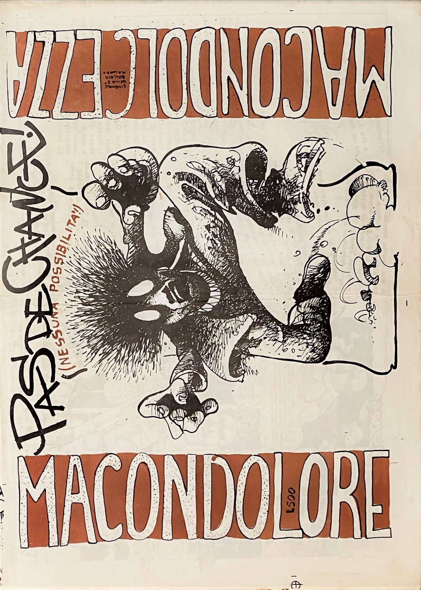 Rara fanzine riccamente illustrata a fumetti, fotografie in b/n e testi calligrafati a stampa. Pubblicata a denuncia dello sgombero da parte della polizia dell'omonimo locale fondato a Milano nell'ottobre del '77 su iniziativa di Mauro Rostagno e Andrea Valcarenghi. Macondo era diventato in un batter d'occhio un microcosmo magico, uno spazio culturale di aggregazione in cui si alternavano le più disparate classi sociali. Insieme a operai, trans, femministe, omosessuali, miliardari e proletari fecero la loro apparizione anche Allen Ginsberg e Vanessa Redgrave, il filosofo Glucksmann e lo psichiatra David Cooper. C'era un ristorante, un bar, una rivendita dell'usato, uno spazio adibito a convegni. Il 22 febbraio del 1978 irruppero le forze dell'ordine con l'accusa di associazione a delinquere finalizzata allo spaccio. Ebbe così fine una valida e provocatoria alternativa alla lotta armata, rivendicava Jacopo Fo in un'intervista. In ottimo stato.