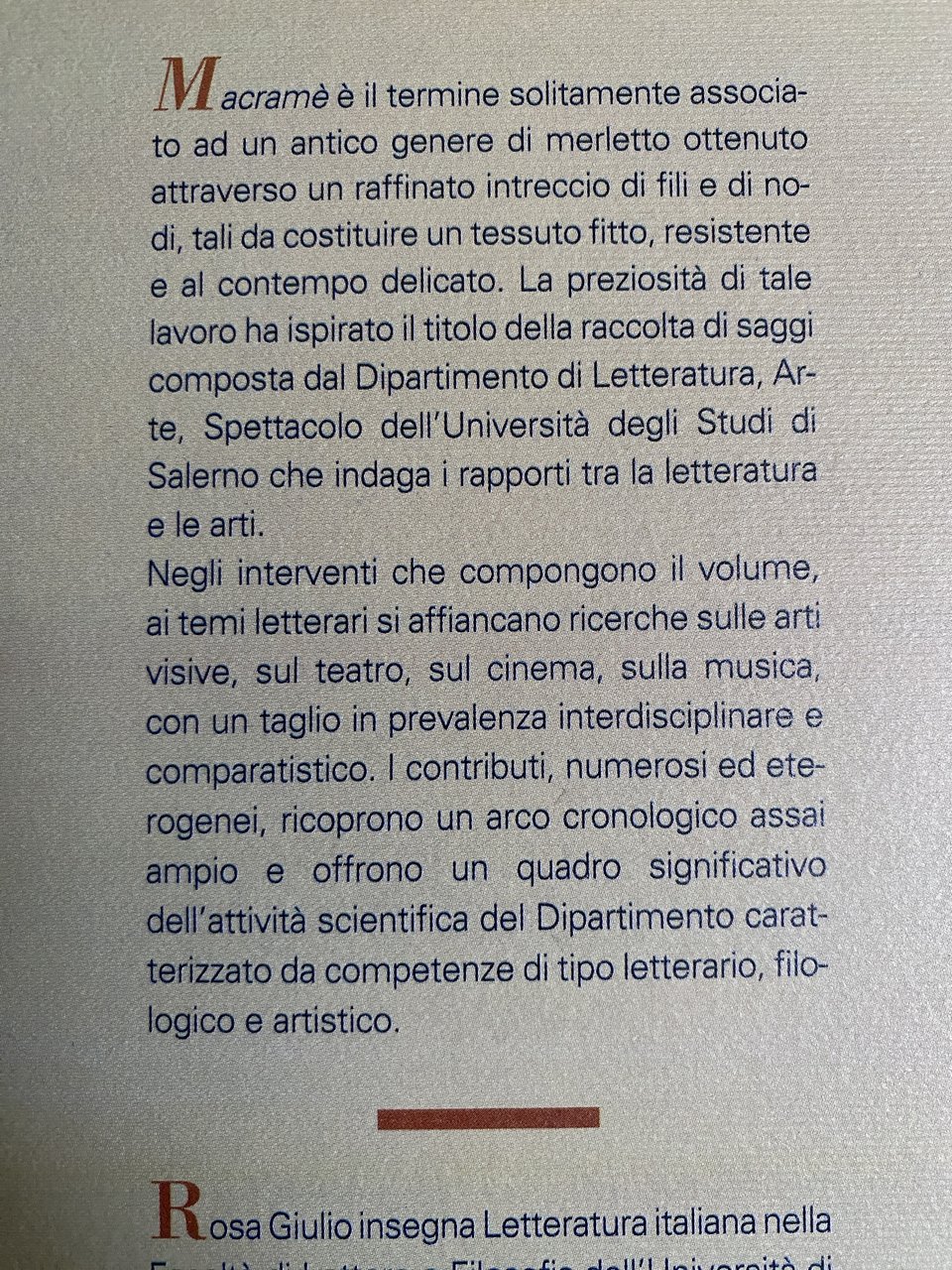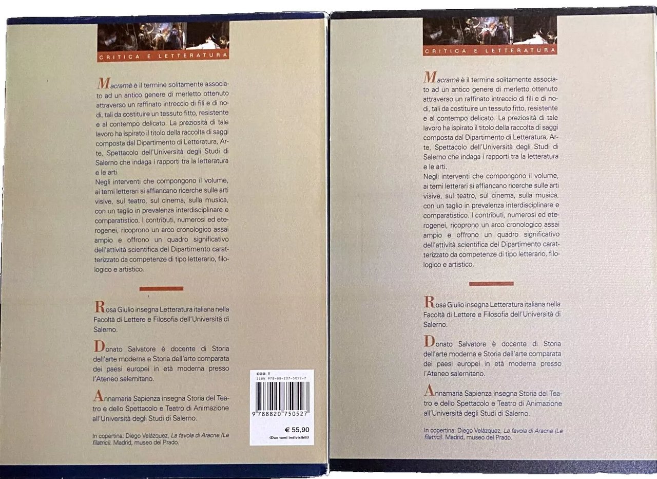 Macramè è il termine solitamente associato ad un antico genere di merletto ottenuto attraverso un raffinato intreccio di fili e di nodi, tali da costituire un tessuto fitto, resistente e al contempo delicato. La preziosità di tale lavoro ha ispirato il titolo della raccolta di saggi composta dal Dipartimento di Letteratura, Arte, Spettacolo dell'Università degli Studi di Salerno che indaga i rapporti tra la letteratura e le arti. Negli interventi che compongono il volume, ai temi letterari si affiancano ricerche sulle arti visive, sul teatro, sul cinema, sulla musica, con un taglio in prevalenza interdisciplinare e comparatistico. I contributi, numerosi ed eterogenei, ricoprono un arco cronologico assai ampio e offrono un quadro significativo dell'attività scientifica del Dipartimento caratterizzato da competenze di tipo letterario, filologico e artistico.