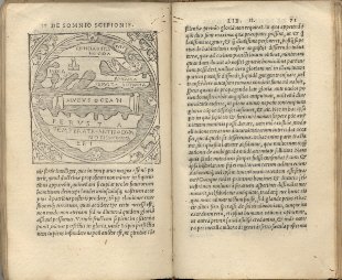 In 16°, p. perg. molle, cc.nn. 12 di indice + cc.n. 279 + 6 piccole inc. schematiche nel t. + 1 inc. di cm. 7,3 x 7 raffigurante la teoria del Macrobius in cui le Terre del Nord sono difronte alle Terre del Sud e tra di esse si trova l'Oceano. Il vol. presenta il colophon e non il front. Segni di ex lacci. Carta e stampa fresche. Chiose scritte a mano su alcune pp. Marca tipografica sul retro dell'ultima carta.
