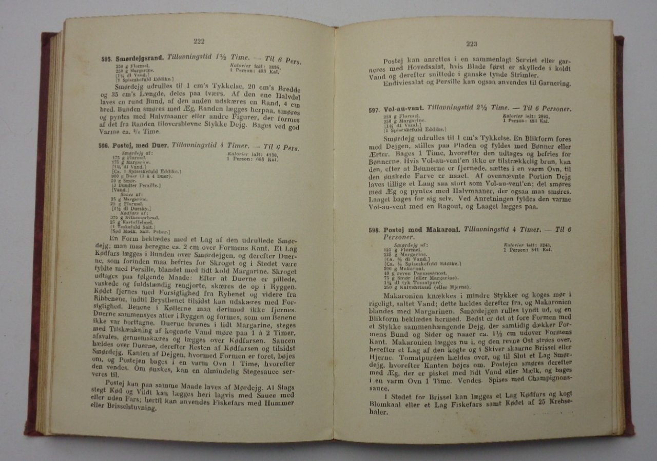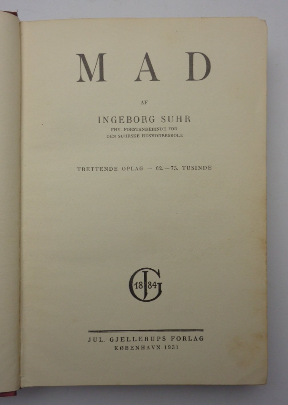 Un volume (22 cm) di 432 pagine. In lingua danese. Trettende oplag, 62-75 tusinde. Alcune (rare) note a matita al margine; lunghe annotazioni manoscritte nelle pagine finali bianche riservate agli appunti. Legatura editoriale in tela percallina con vecchie macchie chiare di umidità. Buone condizioni complessive per questo che rimane il più famoso libro di cucina della Danimarca.