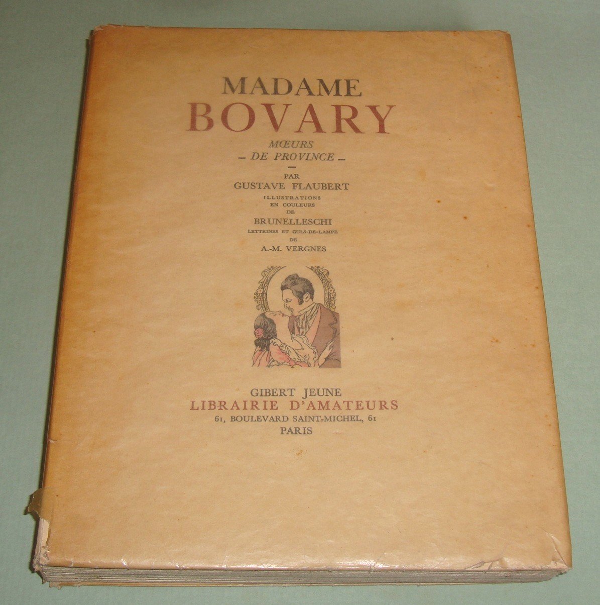 FLAUBERT Gustave. Madame Bovary moeurs de province. Paris, Librairie d'Amateurs, s.a. (1953). In 4to; pp. 306. Copertine editoriali. 16 illustrations en coleurs de Brunelleschi, lettrines et culs de lampe de A. M. Vergnes. Edizione a tiraggio limitato, copia n. 206 di 3000.