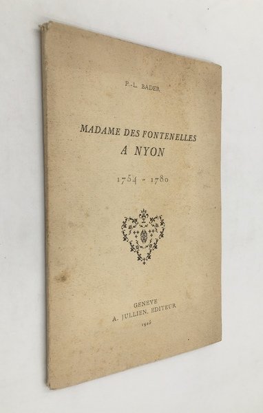 In-8° (cm. 25,4), pp. 35, (1) con bella riprod. di VEDUTA "sépia" in antiporta. Cartoncino leggero editoriale con fodera editoriale (chemise), distinta veste tipografico-editoriale, carta di pregio nelle sue barbe. Marthe-Catherine CHABROL (1695-1780) detta Mme de Fontenelles, originaria di Loudun, vedova della guardia del corpo del Duca d'Orléans, calvinista ugonotta rifugiata in Svizzera a Nyon con molti correligionari poveri dei quali fu grande benefattrice.