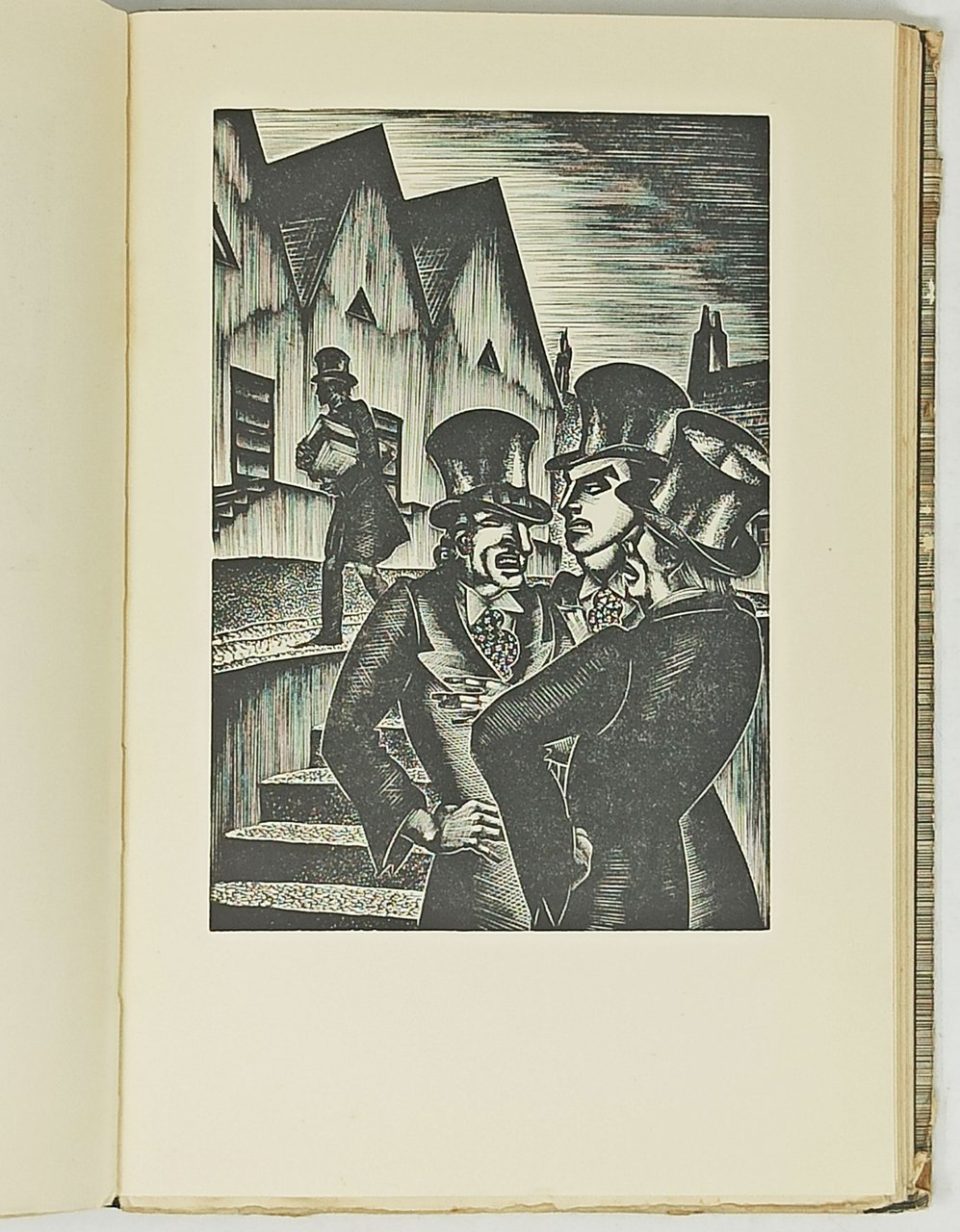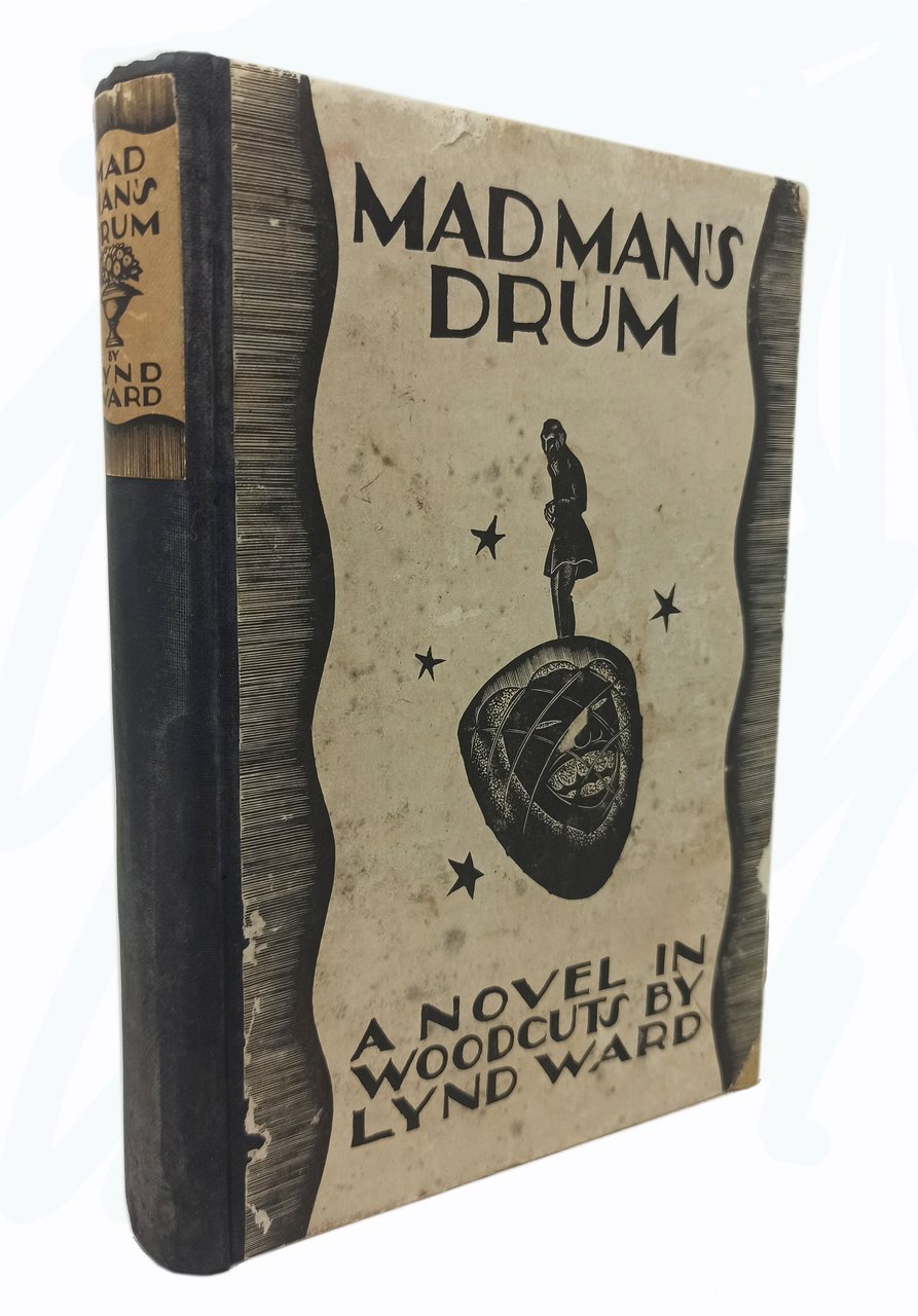FIRST PUBLISHED. Genere: Romanzo senza parole. Pagine non numerate: il libro è costituito interamente da belle xilografie in nero a piena pagina (non vi è testo). In totale sono presenti 118 tavole in xilografia. Dimensioni: 14 x 20,5 cm circa. Stato di conservazione: Bordi della copertina un po' consumati, minuscole mancanze sul margine sinistro del rivestimento in carta (illustrato) applicato sul piatto anteriore, dorso con un leggero alone, rari e marginali ingiallimenti della carta, un numero romano scritto a penna sul margine inferiore del piatto posteriore, un appunto (di appartenenza) a biro sul margine superiore della prima pagina e una firma d'appartenena a biro sul margine superiore del frontespizio ma, nel complesso, un buon esemplare. Copertina cartonata rigida con dorso in tela e piatti rivestiti con carta illustrata. Un'etichetta in carta applicata sul margine superiore del dorso. Le 118 incisioni su legno narrano la storia di un commerciante di schiavi che, rubando un tamburo su cui è presente il volto di un demone, espone sè e la propria famiglia ad una maledizione. PRIMA EDIZIONE DI UN'OPERA DAVVERO PARTICOLARE, DA COLLEZIONE.