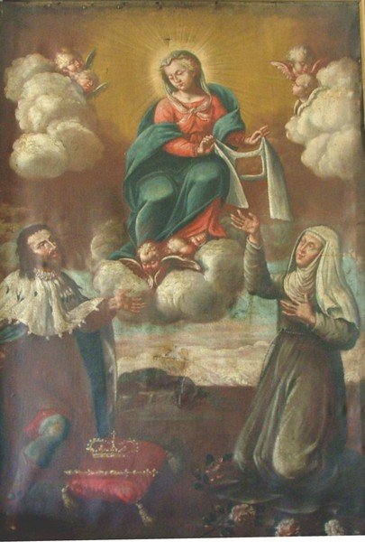 Madonna Assunta contornata da Cherubini. Ai lati inginocchiati: una figura di Re, sconosciuto, ed una Suora.