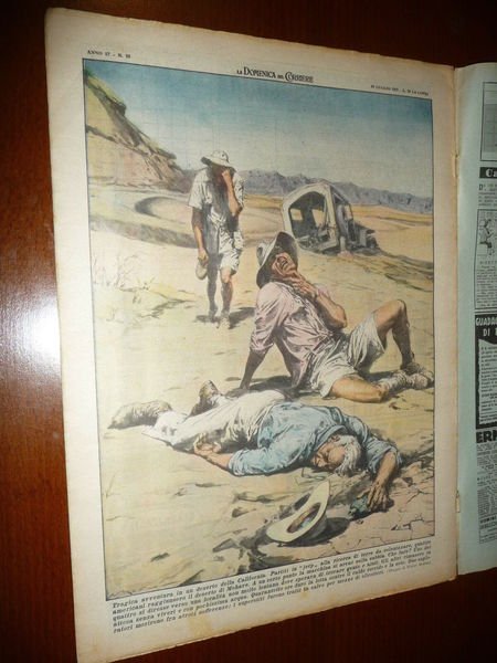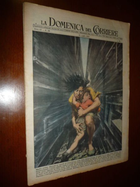DESCRIZIONE: Domenica del Corriere, Milano, Anno 57 n. 28 (10 luglio 1955). COPERTINA: Davanti al casello di Castellazzo sulla linea Milano-Novara una madre si accorge che il suo bimbo tra i binari, si lancia a soccorrerlo, mentre contemporaneamente passsano due treni. RETRO: Quattro escursionisti vittime del deserto Mohave in California. La Domenica del Corriere è stato un popolare settimanale italiano fondato a Milano nel 1899 e chiuso nel 1989. Apparve per la prima volta nelle edicole l'8 gennaio 1899 come supplemento illustrato del Corriere della Sera. Stampata in grande formato (sul modello del domenicale La Tribuna illustrata), aveva 12 pagine e veniva distribuita gratis agli abbonati del Corriere, oppure si poteva acquistare in edicola per 10 centesimi. La prima e ultima di copertina erano sempre disegnate. Il Corriere si avvaleva di un giovane disegnatore, Achille Beltrame, allora sconosciuto, a cui veniva affidato in ogni numero il compito di rendere con la sua tavola il fatto più interessante della settimana. Dopo la sua morte nel 1945, fu sostituito da Walter Molino che, come il suo predecessore, firmò memorabili copertine. A differenza dei settimanali dell'epoca, la Domenica del Corriere diede ampio spazio alle fotografie e ai disegni, e questo fu uno dei motivi del suo successo. CONDIZIONI: Buone con spillette, con sovracc. azzurrina, tracce di fox. PESO / WEIGHT: 94 gr. without package.