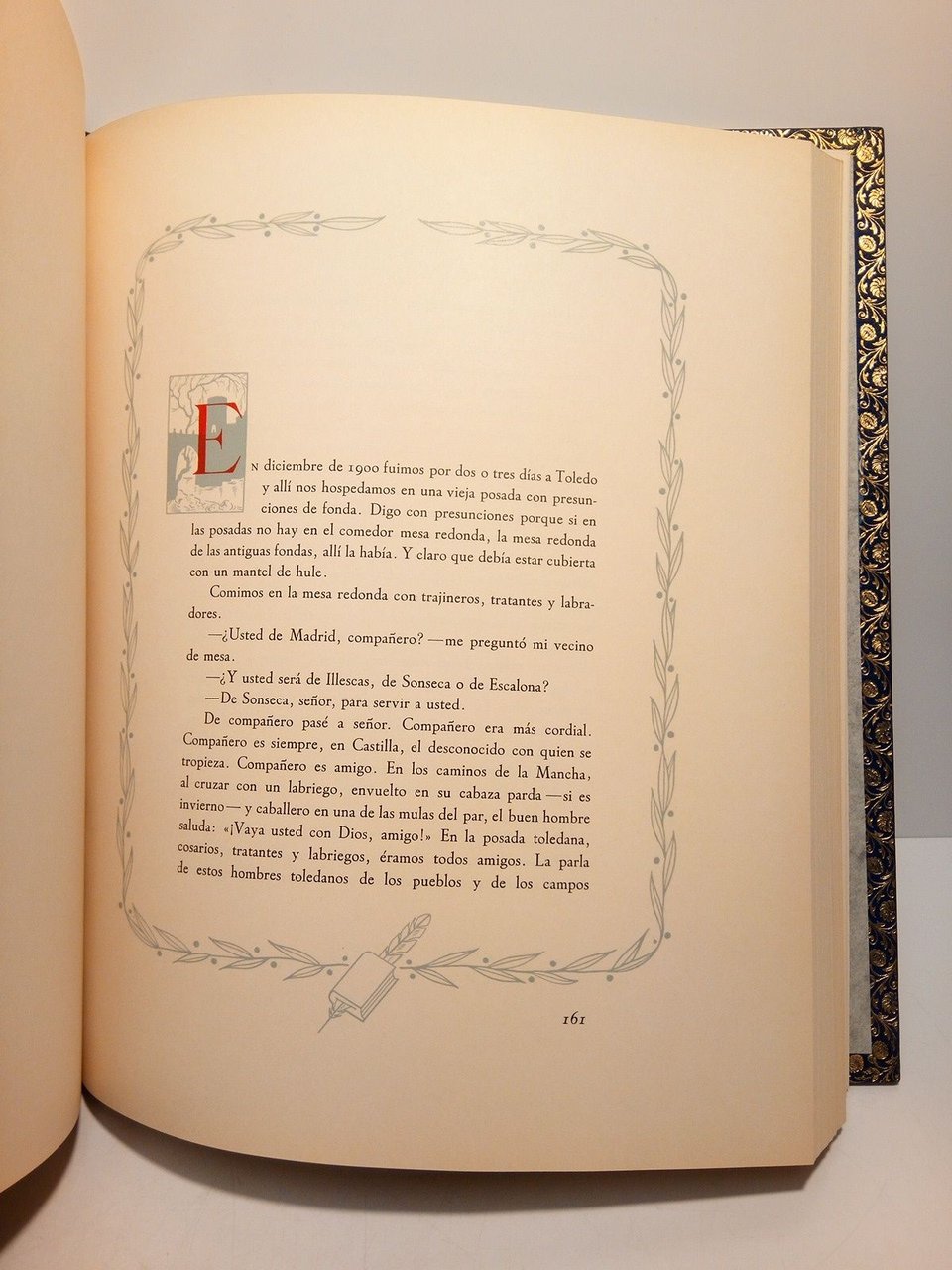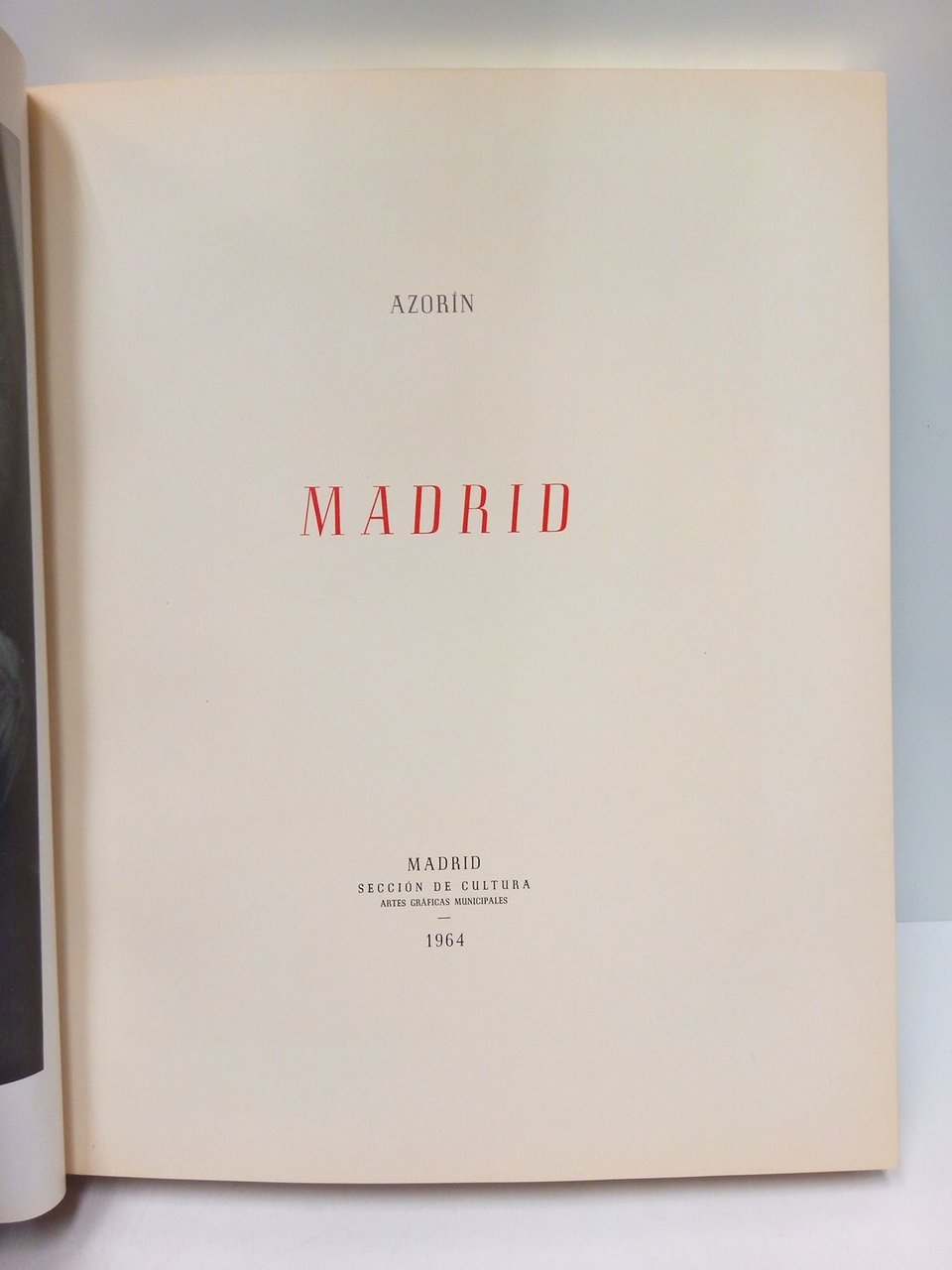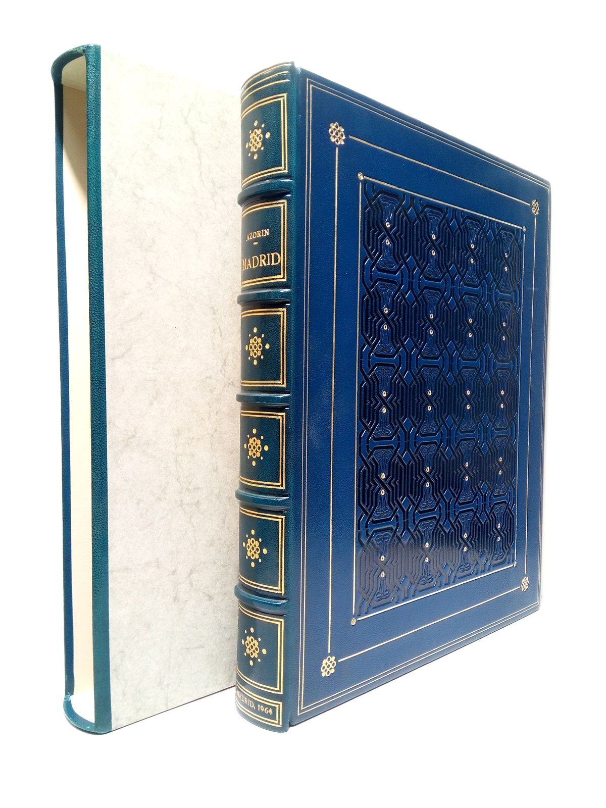 [EDICION DE LUJO].- Madrid: [Ayuntamiento de Madrid] Sección de Cultura (Artes Gráficas Municipales), 1964.- 318 p., [1 h.]: Retrato de Azorín en la contraportada; Folio (30,5 x 25 cm); Excelente impresión a tres tintas sobre papel ahuesado de gran calidad, texto orlado, artísticas letras capitulares; Magnífica encuadernación de gran lujo en Plena Piel chagrén azul, lomo dorado, tapas con filetes dorados en paralelo recuadrando y plancha en seco con motivos geométricos, cantos con filete dorado, contracantos con rueda dorada, cabeza dorada, guardas en papel marbreado, estuche.- Tras la portadilla indica: Del presente MADRID, de Azorín, el Ayuntamiento de la Capital ha numerado 500 ejemplares destinados al autor [pero este no va numerado].- EJEMPLAR MUY RARO.* Excelente estado. Sin duda un ejemplar de los que se encuadernaron especialmente para obsequiar a las autoridades. Aunque no va firmada, por su técnica, la encuadernación está sin duda ejecutada por un gran maestro encuadernador, posiblemente por algun discípulo de Antolín Palomino de la Imprenta Municipal. En una nota preliminar del libro indica: Los tipos utilizados para la composición de este libro son los del Maestro Ibarra, que se conservan en el Ayuntamiento de Madrid. Ibarra es el émulo de Didot en Francia y Bodoni en Italia. MADRID