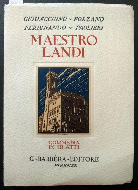 G. Barbèra, Editore, Firenze, 1925. In 8vo, pp. 169, bross. edit. in carta martellata con plancetta a colori e ill.di D. Totani. Commedia in tre atti rappresentata per la prima volta a Milano al teatro Olympia il 19 febbraio 1925 dalla Compagnia Annibale Betrone. Liberamente rielaborata la vicenda vera di Luigi Landi, boia di Firenze, che suo malgrado nel 1830 dovette decapitare il capraio Rosi, e poi cadde in delirio per due settimane. Il Forzano (Borgo San Lorenzo 1883 - Roma 1970) drammaturgo, librettista, regista, liberale e poi nazionalista; diresse "Il giornale apuano" e amava Lizzano Pistoiese. Paolieri (Firenze 1878 -1928), prima macchiaiolo, poi ultracattolico scrittore, apprezzabile soprattutto come cantore della selvaggia Maremma, dei cacciatori e bracconieri. Curioso e non comune. Ancora intonso e in ottimo stato di conservazione.