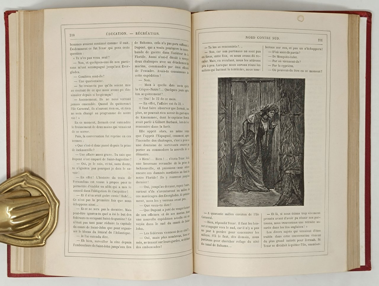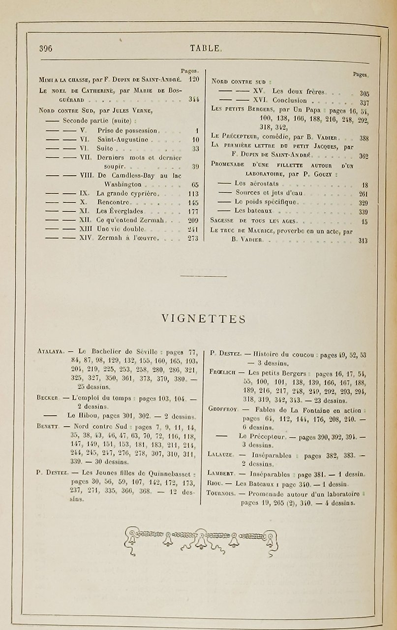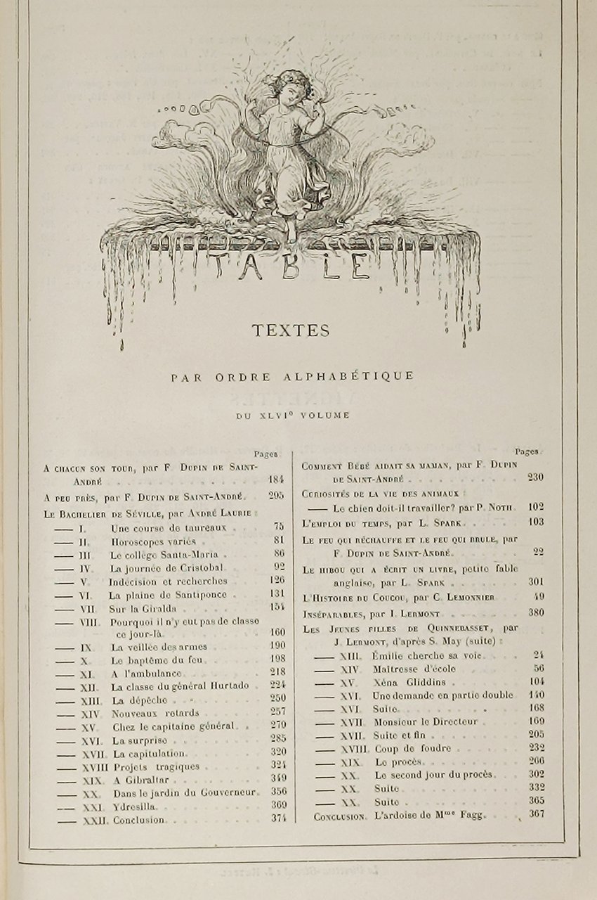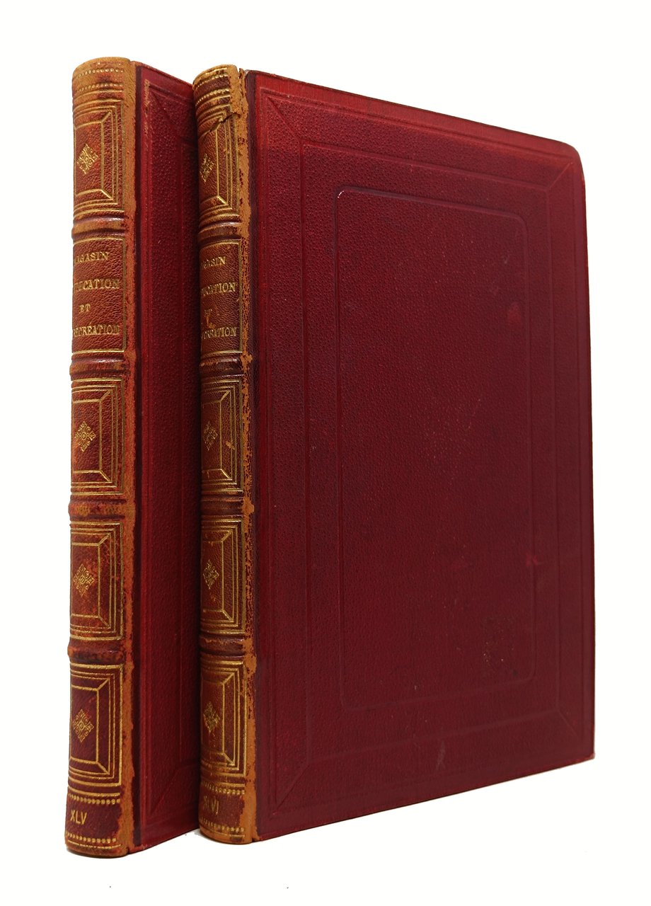 In due tomi, di formato: , è presente l'intera annata 1887 (23° année) della rivista francese 'MAGASIN D'EDUCATION ET DE RECREATION ET SEMAINE DES ENFANTS REUNIS / Journal de toute la Famille'. Nel primo tomo ('45° volume de la collection') è presente l'intero I semestre 1887 mentre nel secpondo tomo ('46° volume de la collection') è rilegato il secondo semestre. Gioranle fondato da P.-J. Stal nel 1864. Directeurs Littéraires: Jules Verne et Jules Hetzel; Jean Macé pour les sciences. Si segnala che in questa annata, tra le altre opere, è presente per intero, il romanzo 'NORD CONTRE SUD' di Verne con le illustrazioni di L. Benett. Stato di conservazione: piccola rottura sul margine superiore del dorso del secondo volume, leggere abrasioni sui margini delle brossure, minuscolo alone (presumibilmente causato da una pregressa umidità) sul margine superiore dei primi fogli del primo tomo, una marginale macchiolina marrone sul margine sinistro di pagina 232 del primo tomo, si è creato un leggero solco tra le due pagine frontali 2 e 3 del primo tomo, Un foro sul bordo bianco superiore del foglio che contiene le pagine 211-212 del secondo volume ma, nel complesso, un esemplare decisamente buono. Privo di mancanze, timbri, firme d'appartenenza, scritte o altri segni di penna o di matita. Belle copertine cartonate rigide editoriali, di colore bordeaux, e titoli e decorazoni in oro sui dorsi, Unghia verniciata in oro. Oltre alle illustrazioni che corredano l'opera di verne sono presenti numerosi altri disegni in nero nel testo (talune anche a piena pagina). Il giornale, con uscita settimanale, si caratterizzava per la collaborazione con i più noti scrittori e illustratori del tempo per esempo: C. Dickens, C. Flammarion, Viollet le Duc, Gustave Doré, Grandville, Yan' Dargente, De Neuville, Maillart, .
