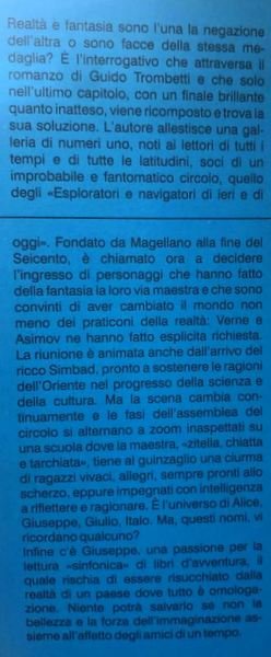 Realtà e fantasia sono l'una la negazione dell'altra o sono facce della stessa medaglia? È l'interrogativo che attraversa il romanzo di Guido Trombetti e che solo nell'ultimo capitolo, con un finale inatteso, viene ricomposto e trova la sua soluzione. L'autore allestisce una galleria di numeri uno, noti ai lettori di tutti i tempi e di tutte le latitudini, soci di un improbabile e fantomatico circolo, quello degli "Esploratori e navigatori di ieri e di oggi". Fondato da Magellano alla fine del Seicento, è chiamato ora a decidere l'ingresso di personaggi che hanno fatto della fantasia la loro via maestra e che sono convinti di aver cambiato il mondo non meno dei praticoni della realtà: Verne e Asimov ne hanno fatto esplicita richiesta. La riunione è animata anche dall'arrivo del ricco Simbad, pronto a sostenere le ragioni dell'Oriente nei progresso della scienza e della cultura. Ma la scena cambia continuamente e le fasi dell'assemblea del circolo si alternano a zoom inaspettati su una scuola dove la maestra, "zitella, chiatta e tarchiata", tiene al guinzaglio una ciurma di ragazzi vivaci, allegri, sempre pronti allo scherzo, eppure impegnati con intelligenza a riflettere e ragionare. È l'universo di Alice, Giuseppe, Giulio, Italo. Ma, questi nomi, vi ricordano qualcuno? Infine c'è Giuseppe, una passione per la lettura "sinfonica" di libri d'avventura, il quale rischia di essere risucchiato dalla realtà di un paese dove tutto è omologazione. Niente potrà salvarlo se non la bellezza e la forza dell'immaginazione assieme all'affetto degli amici di un tempo.