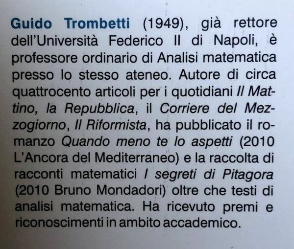 Guido Trombetti (1949), già rettore dell’Università Federico II di Napoli, è professore ordinario di Analisi matematica presso lo stesso ateneo. Autore di centinaia di articoli per i quotidiani Il Mattino, la Repubblica, il Corriere del Mezzogiorno, Il Riformista, ha pubblicato il romanzo Quando meno te lo aspetti (2010 L’Ancora del Mediterraneo) e la raccolta di racconti matematici I segreti di Pitagora (2010 Bruno Mondadori) oltre che testi di analisi matematica.