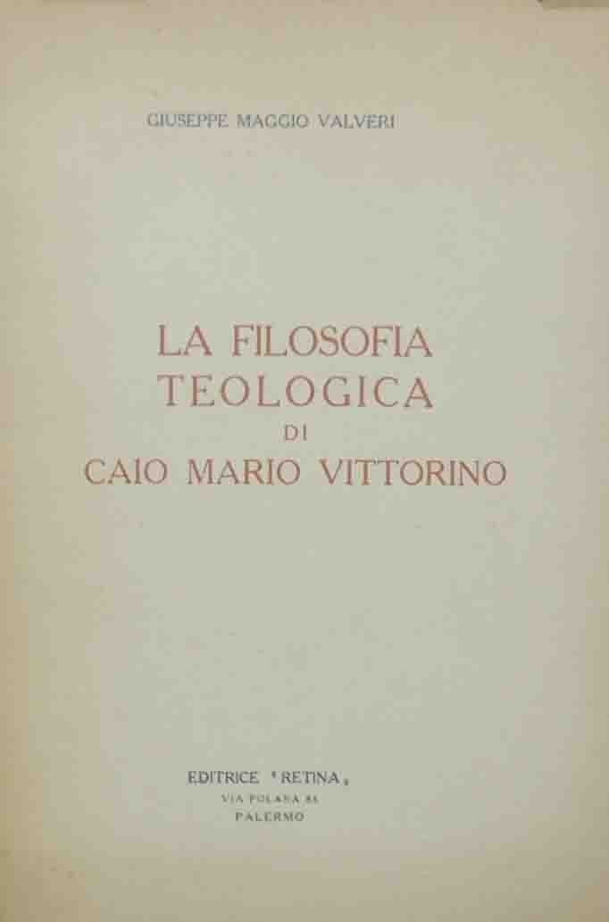 Giuseppe Maggio Valveri, La filosofia teologica di Caio Mario Vittorino, Editrice Retina, Palermo 1950, pp. 93, cm 25, br. ed. Minime fioriture alla brossura, carta lievemente brunita, una piccolissima mancanza ad una carta, per il resto molto ben conservato. Estremamente raro.