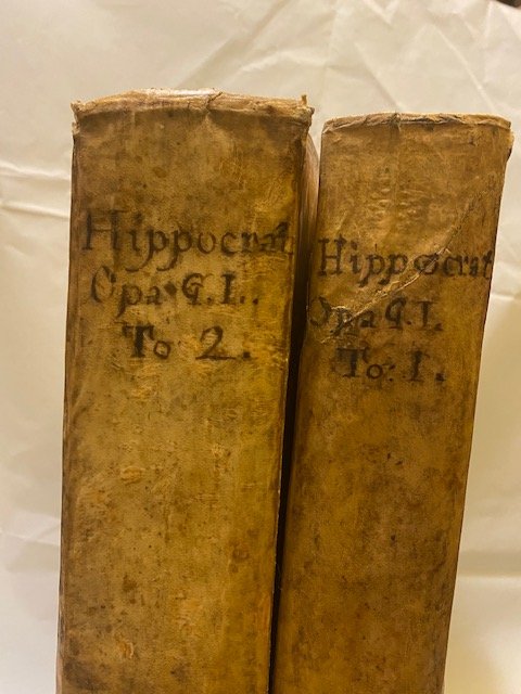 Opera in due volumi con belle legature coeve in tutta pergamena morbida, titolo manoscritto al dorso, buone condizioni generali, carte lievemente brunite a tratti, mancanza al margine bianco nell'angolo superiore delle ultime 4 carte senza perdita di testo. Ritratto di Ippocrate nell'antiporta del primo volume. Testo su due colonne in greco e in latino. Seconda parte: Oeconomia Hippocratis alphabeti serie distincta opus non solum tyronibus sed etiam artis apollineae mystagogis.in quo dictionum apud Hippocratem.Anutio Foesio Mediomatrico Medico authore.Cfr. Wellcome III, 269.