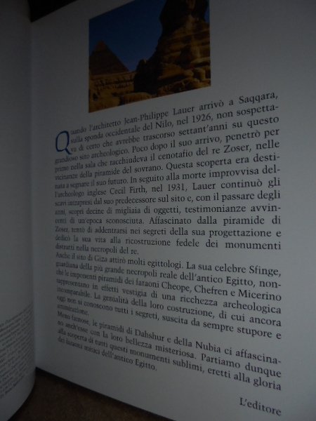 AA.VV. Novara, De Agostini, 2005. Magnifiche Piramidi e Sfingi misteriose. Egitto storia e mistero. In-8° grande, cartonato edit. ill. a coll. 125, (1) pp. con numerose illustrazioni a colori anche a piena pagina. Come nuovo. Neg. sotto Hoepli.
