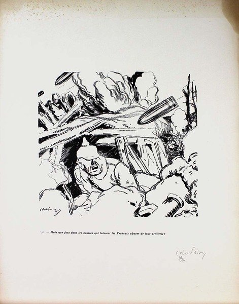 Abel Jules Faivre (Lione 1867 - Nizza 1945) Litografia originale firmata a mano dall'artista.Dimensioni: 56 x 38,5 cmCon certificato di autenticità C.O.A.Ingiallimento laterale come da foto.Esemplare numero 62/250 La raccolta di litografie umoristiche del caricaturista francese Abel Faivre (Lione 1867-Nizza 1945), andata a confluire nel volume Jours de guerre,fu pubblicata in due tomi tra il 1915 e il 1919. Con il procedere del conflitto, l'opinione pubblica di tutti i paesi coinvolti,che aveva dapprima affrontato tale evento con ottimismo, mutò rapidamente opinione sino a considerare la guerra, senza mezzi termini,come un avvenimento rovinoso. In tale contesto, le vignette satiriche di guerra possedevano un potente effetto catartico,adempivano un ruolo sociale irrinunciabile, fornendo una valvola di sfogo all’incombere dal più cupo pessimismo. Abel Jules Faivre (Lyon 1867 - Nizza 1945) Originale Lithographie vom Künstler von Hand signiert.Abmessungen: 56 x 38,5 cmMit Echtheitszertifikat C.O.A.Seitliche Vergilbung wie auf dem Foto.Kopieren Sie die Nummer 62/250 Die Sammlung humorvoller Lithographien des französischen Karikaturisten Abel Faivre (Lyon 1867-Nizza 1945), die in den Band Jours de guerre floss,es wurde zwischen 1915 und 1919 in zwei Bänden veröffentlicht. Im Verlauf des Konflikts wurde die öffentliche Meinung in allen beteiligten LändernWer dieses Ereignis anfangs mit Optimismus konfrontiert hatte, änderte schnell seine Meinung, um den Krieg ohne Zweifel zu betrachten.wie ein ruinöses Ereignis. In diesem Zusammenhang hatten die satirischen Kriegskarikaturen eine starke kathartische Wirkung.Sie erfüllten eine unverzichtbare soziale Rolle und bildeten ein Entlastungsventil gegen den dunkelsten Pessimismus. Abel Jules Faivre (Lyon 1867 - Nice 1945) Lithographie originale signée à la main par l'artiste.Dimensions: 56 x 38,5 cmAvec certificat d'authenticité C.O.A.Jaunissement latéral comme sur la photo.Copie numéro 62/250 La collection de lithographies humoristiques du caricaturiste français Abel Faivre (Lyon 1867-Nice 1945), qui allait se fondre dans le volume Jours de guerre,il a été publié en deux volumes entre 1915 et 1919. À mesure que le conflit progressait, l'opinion publique de tous les pays impliqués,qui avait d'abord fait face à cet événement avec optimisme, a rapidement changé d'avis pour envisager la guerre, en termes non équivoques,comme un événement ruineux. Dans ce contexte, les caricatures de guerre satiriques ont eu un puissant effet cathartique,ils remplissaient un rôle social indispensable, fournissant une soupape de décharge du pessimisme le plus sombre. Abel Jules Faivre (Lyon 1867 - Nice 1945) Original lithograph signed by hand by the artist.Dimensions: 56 x 38.5 cmWith certificate of authenticity C.O.A.Lateral yellowing as in the photo.Copy number 62/250 The collection of humorous lithographs by the French caricaturist Abel Faivre (Lyon 1867-Nice 1945), which went to flow into the volume Jours de guerre,it was published in two volumes between 1915 and 1919. As the conflict progressed, public opinion in all the countries involved,who had initially faced this event with optimism, quickly changed his opinion to consider the war, in no uncertain terms,like a ruinous event. In this context, the satirical war cartoons had a powerful cathartic effect,they fulfilled an indispensable social role, providing a relief valve from the darkest pessimism.