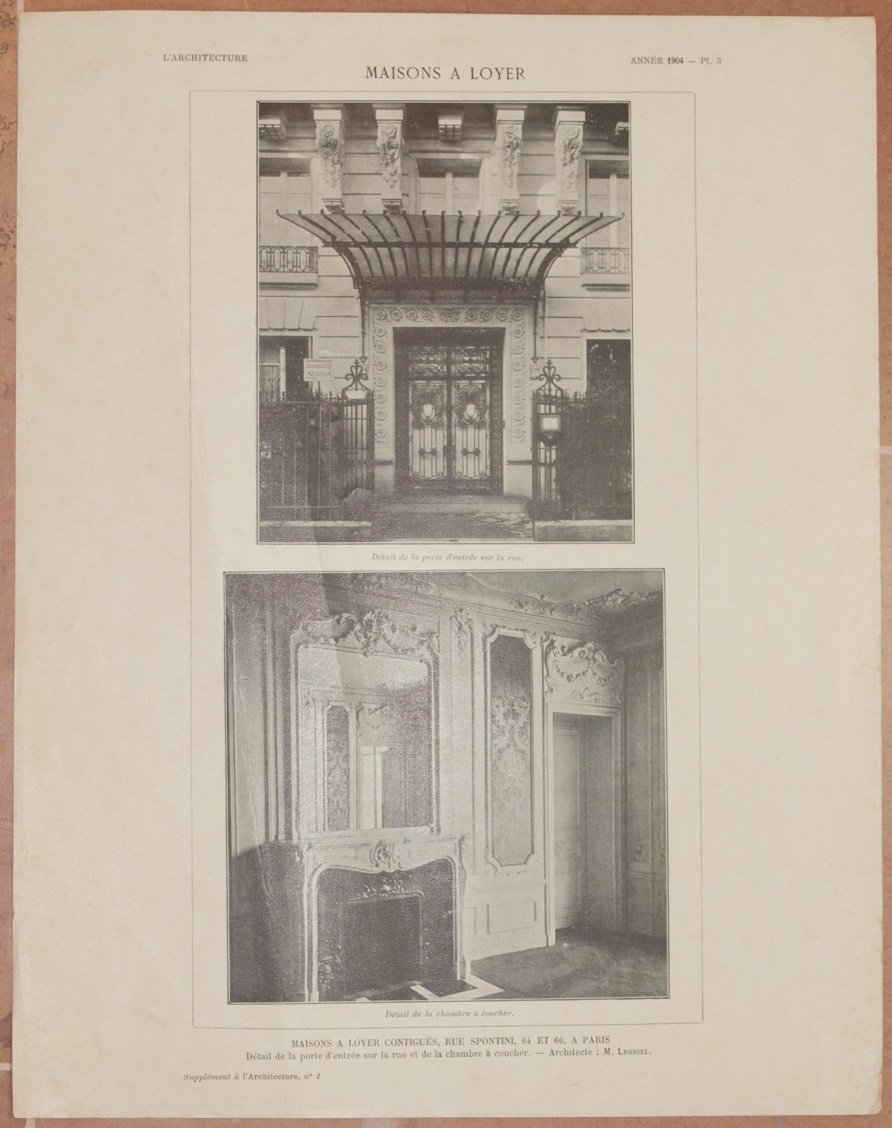 MAISONS A LOYER ANNEE 1904 - PL. 3 MAISONS A LOYER CONTIFUES, RUE SPONTINI 64 ET 66, A PARIS Detail de la porte d'entrèe sur la rue et de la chambre à coucher ARCHITECTE: M. Legriel