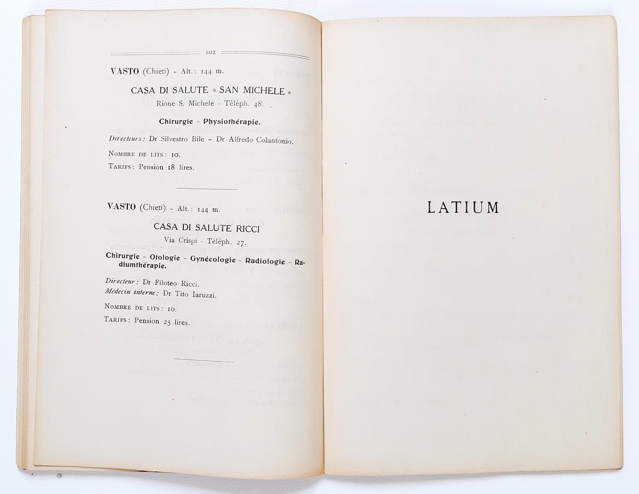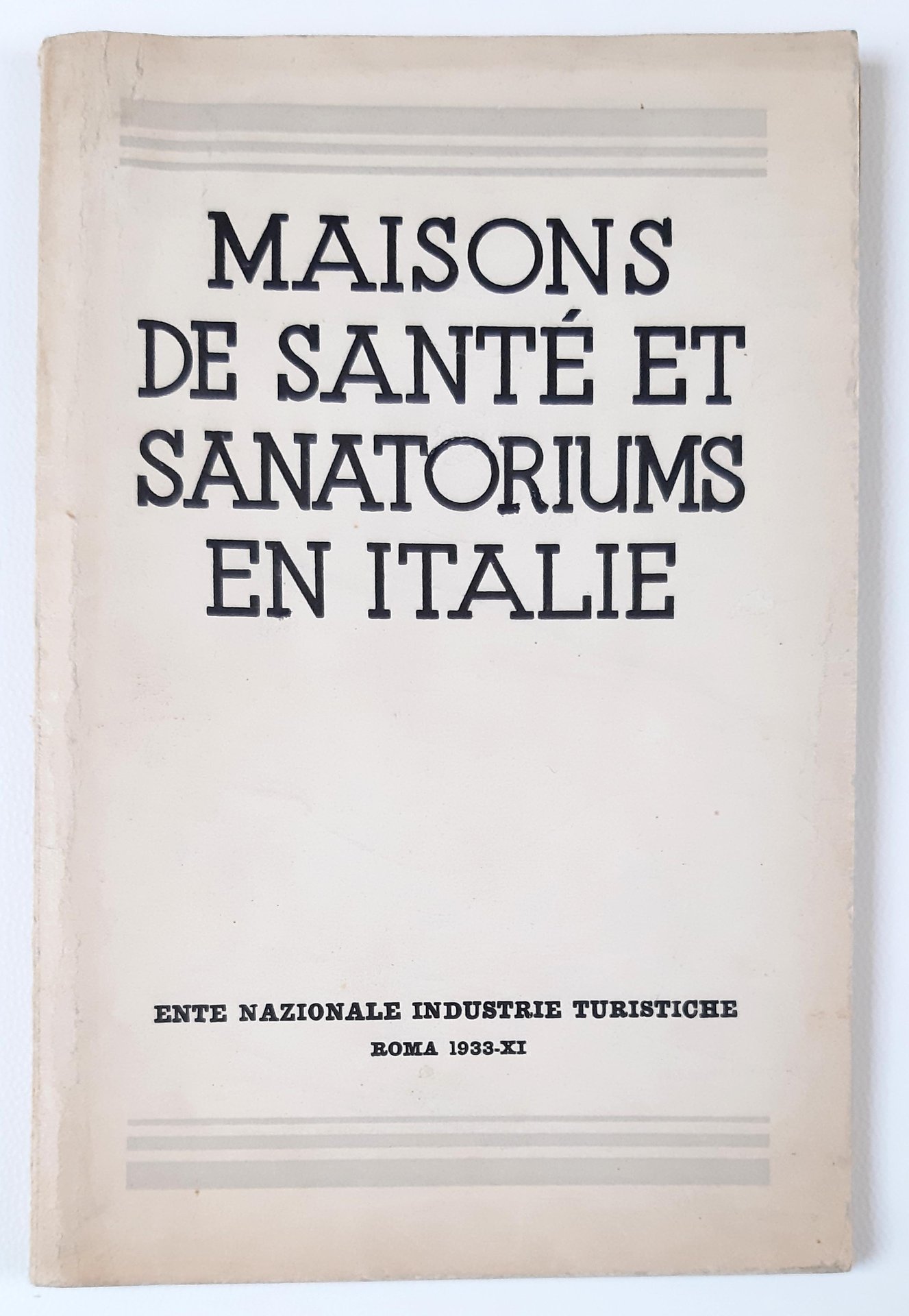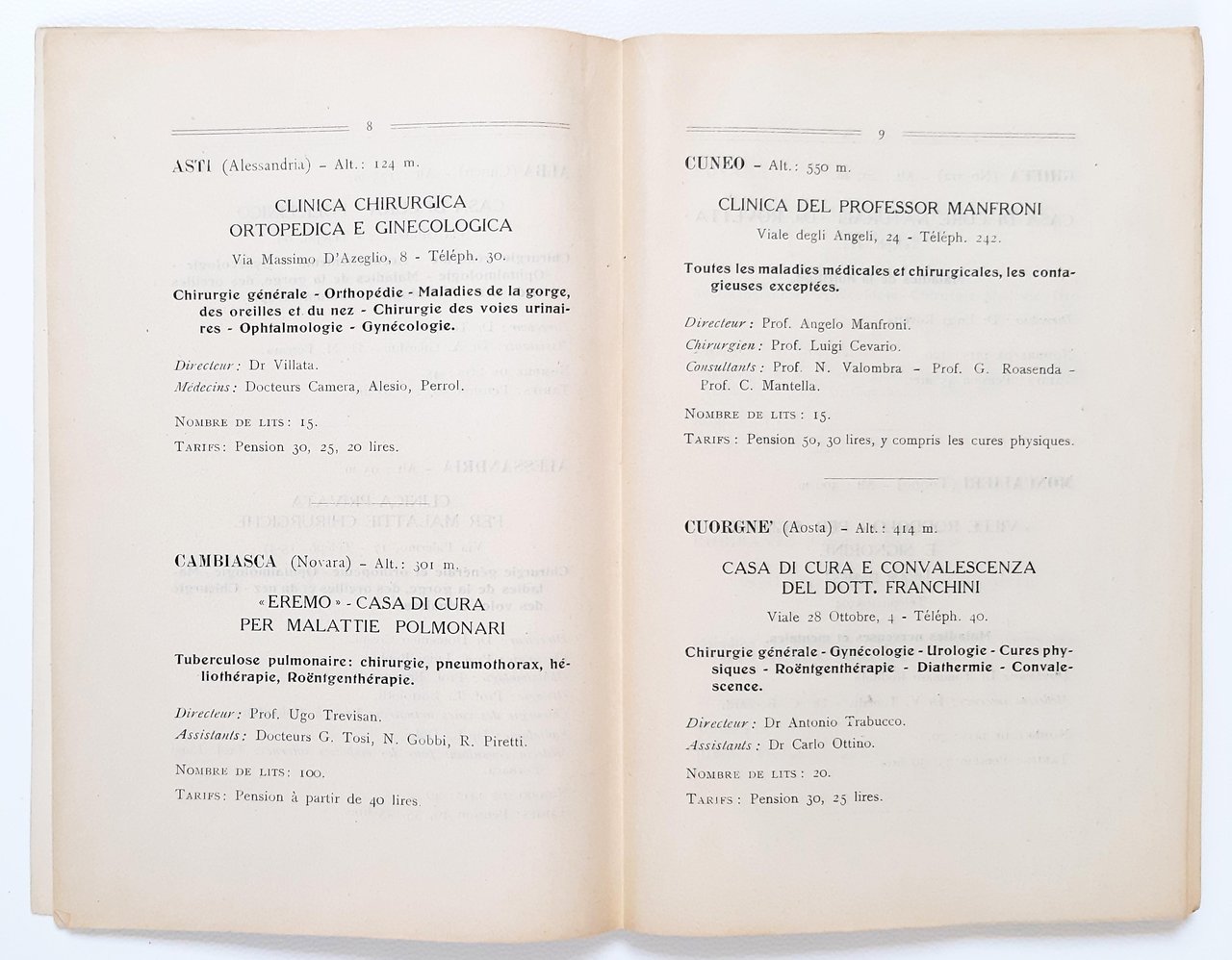Un volumetto, cm 20,5 x 13,5; pp. 150; leg. in brossura ed. in cartoncino bianco con titolo in nero al piatto ant.; front. in nero con titolo entro cornice a doppio filetto; elenco delle case di cura, di salute, solarium, policlinici, istituti di cura, cliniche private, ecc., ubicate in Italia, suddivise per regioni e con indirizzi e nominativi dei relativi primari. Opera interessante e poco diffusa. Rif.: IT\ICCU\CUB\0389646. Cond.: segni d'uso e pieghe alla coperta, interno perfetto; opera in buone condizioni generali.