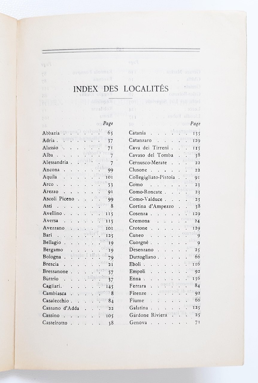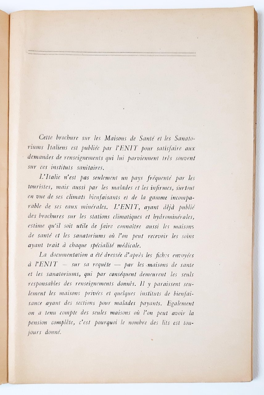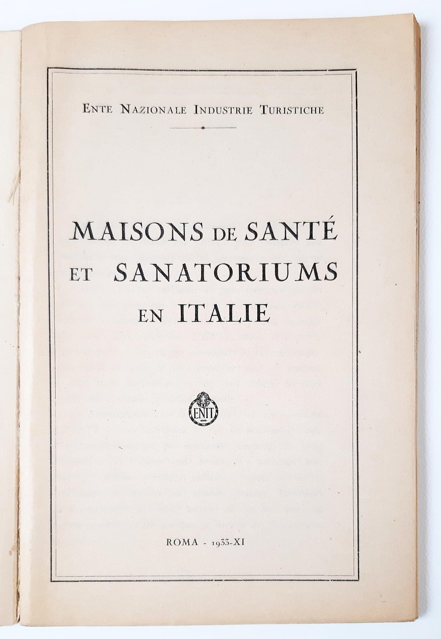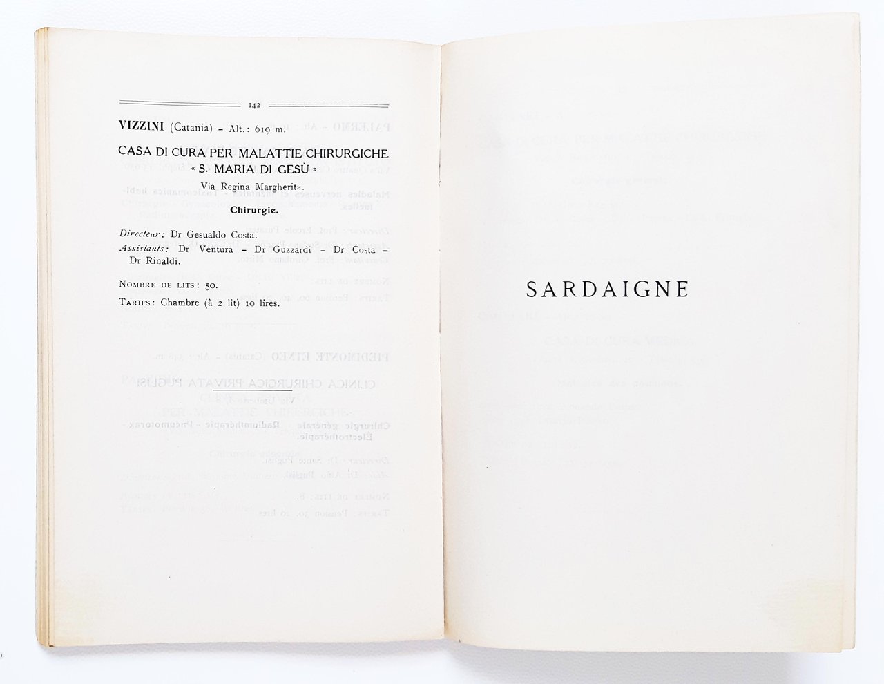 Un volumetto, cm 20,5 x 13,5; pp. 150; leg. in brossura ed. in cartoncino bianco con titolo in nero al piatto ant.; front. in nero con titolo entro cornice a doppio filetto; elenco delle case di cura, di salute, solarium, policlinici, istituti di cura, cliniche private, ecc., ubicate in Italia, suddivise per regioni e con indirizzi e nominativi dei relativi primari. Opera interessante e poco diffusa. Rif.: IT\ICCU\CUB\0389646. Cond.: segni d'uso e pieghe alla coperta, interno perfetto; opera in buone condizioni generali.
