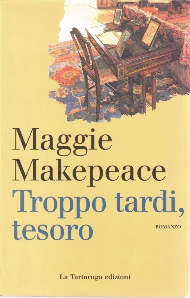 Maggie Makepeace, Troppo tardi, tesoro, La Tartaruga edizioni, Milano 1996, pp. 251, cm 21, br. ed. con alette. Titolo originale: Breaking the chain. Traduzione di Tiziana Bertelli. Leggere tracce d’uso, minima ingiallitura della carta, per il resto buona copia.