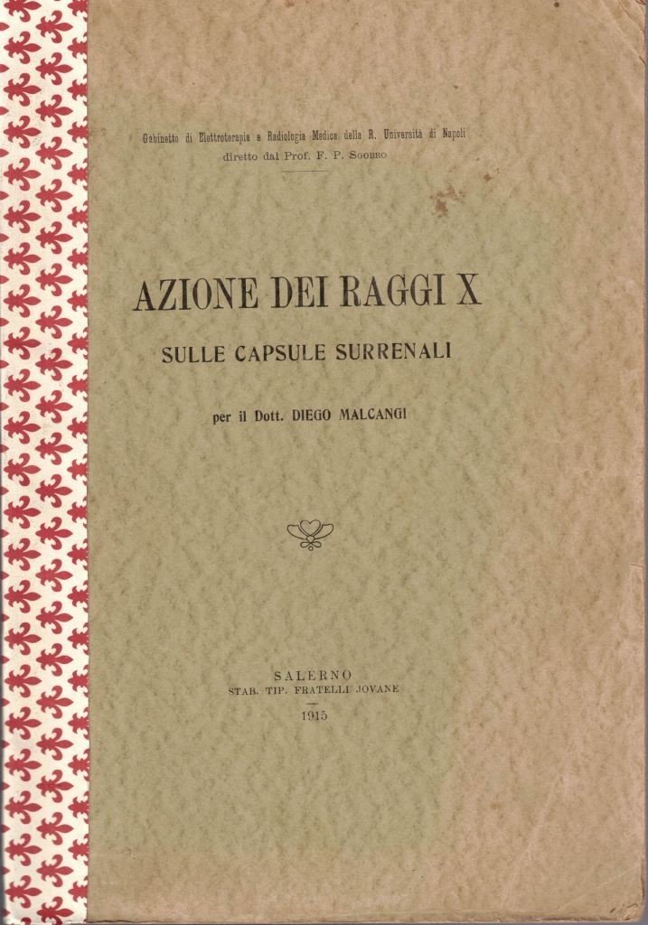 Azione dei raggi X sulle capsule surrenali, per il Dott. Diego Malcangi, Stab. Tipografico Fratelli Jovane, Salerno 1915, pp. 140, 7 c. di tavv. f.t. ill. b.n., 1 c. di tav. ripiegata con grafico, cm 27, br. ed. In testa al frontespizio: Gabinetto di Elettroterapia e Radiologia medica della R. Università di Napoli diretto dal prof. F. P. Sgobbo. Tracce d’uso alla brossura, dorso rinforzato in carta, uno strappetto senza mancanze ad una carta interna, per il resto leggera brunitura della carta, ma nel complesso buona copia, con interno integro e pulito e di perfetta fruibilità. Raro.