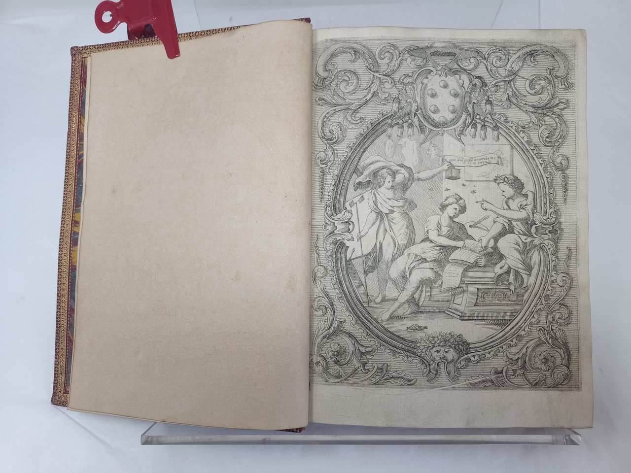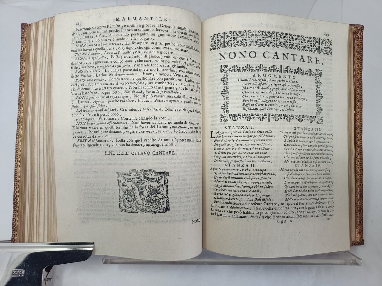 >in-4, ff. (8, compreso l'antiporta inc.), pp.545, (2); leg. 800esca p. marocchino granata, tit. oro al dorso, tagli dorati, dentelle interne. Grazioso antiporta inciso in rame con figure allegoriche entro cornice riccamente ornata con motivi vegetali e floreali, sormontata dallo stemma cardinalizio del dedicatario, Leopoldo de'Medici (già morto al momento della stampa del volume, che reca la congiunta dedicatoria di Paolo Minucci (Puccio Lamoni al di lui nipote, Francesco Maria de'Medici). Testatine, capilettera e finalini riccamente istoriati in xilografia. Seconda edizione (edizione originale, Firenze 1676) bella e pregiata, la prima curata dal Minucci con largo commento, prezioso dal punto di vista filologico. L'opera, ripartita in dodici libri, fu intesa dal Lippi come burlesca parodia della "Gerusalemme Liberata", basata sulla contesa tra Celidora e Bertinella per il reame di Malmantile, castello diroccato presso Signa. Linguisticamente molto importante perché l'autore (poeta e valente pittore 1606-1665) vi ha raccolto la lingua viva del popolo fiorentino alla metà del secolo XVII. Magnifico esemplare. Gamba 595. Razzolini p. 200. STC XVIIs, 488. Cat. Vinciana, III, 2941. Olschki, Choix, XII, 18537.