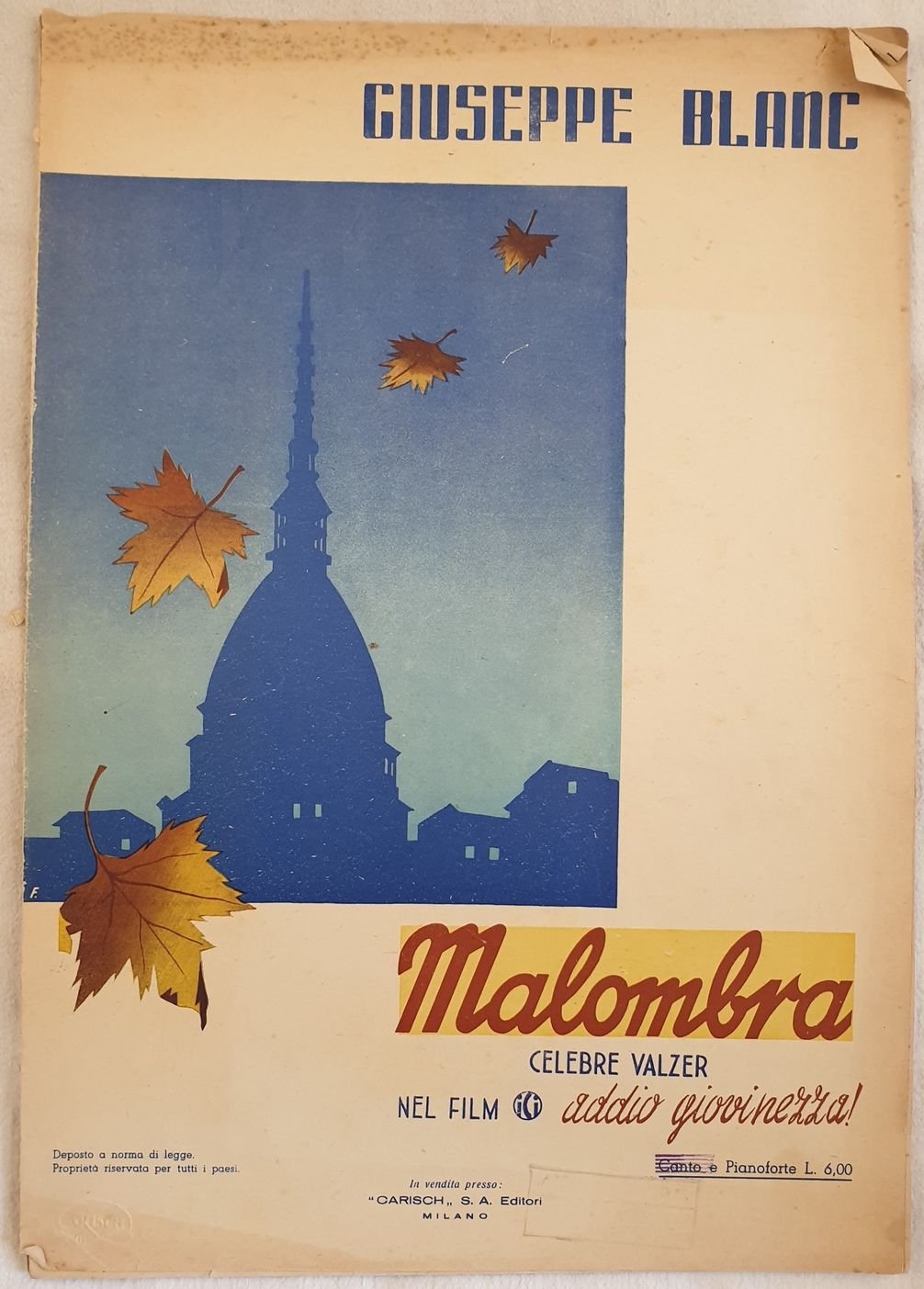 Bello spartito del 1940 della canzone Malombra nel film "Addio giovinezza!" del compositore Giuseppe Blanc. All'interno partitura per pianoforte. In discrete condizioni con fioriture, usure e strappi marginali. Legatura assente. Formato cm. 35x24,5. Pp. 5. Beautiful musical score of 1940 of the song Malombra of the movie "Addio giovinezza!" by the composer Giuseppe Blanc Inside musical score for piano. In fair conditions with foxings, wearings, tears. Binding is missing. Size cm. 35x24,5. Pp. 5.