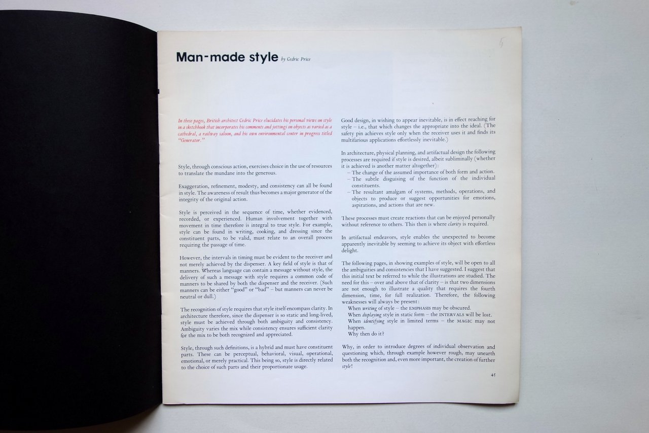 Brossura, Man - Made Style by Cedric Price Senza dati tip., s. d. ma anni '60 - '70 del Novecento; cm 26x25; pp. da 45 a 56 (esemplare autonomo, probabilmente estratto da pubblicazione) con varie ill. in b/n ritoccate con note, frecce ecc. in rosso (vedi foto). Cartoncino ed. Testo in inglese. Condizioni di conservazione Esemplare molto ben conservato. Interni ottimi. Architettura. Avanguardia. In these pages, British architect Cedric Price elucidates his personal views on style in a sketchbook that incorporates his comments and jottings on objects as varied as a cathedral, a railway station, and his own environmental center in progress titled 'Generator' [.]". SC03.D17366 N "