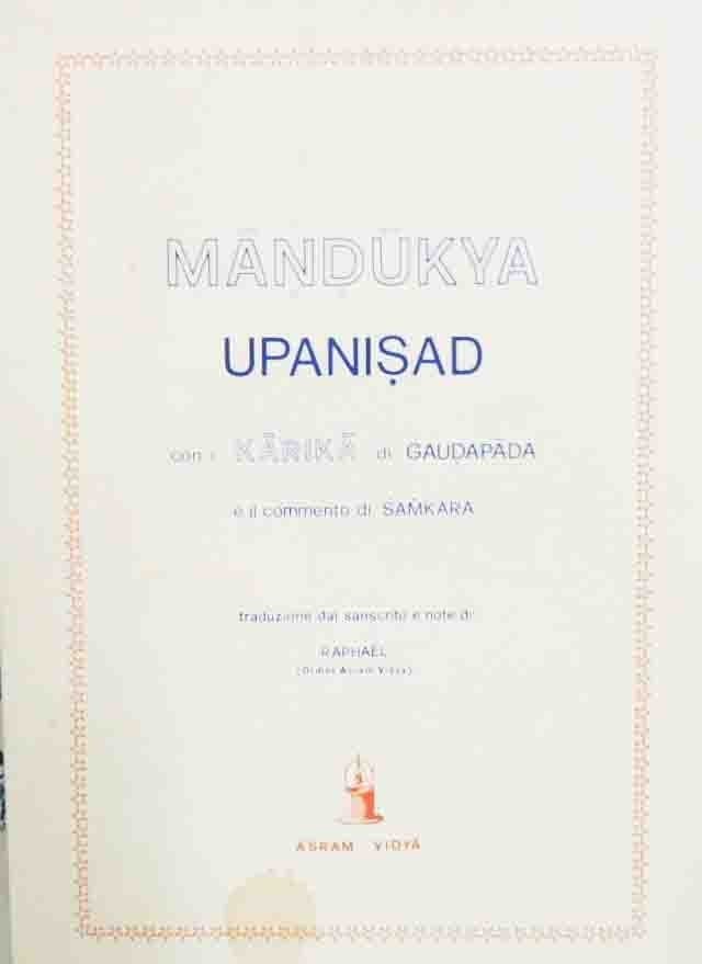 Mandukya Upanisad. Con i Karika di Gaudapada e il commento di Samkara, traduzione dal sanscrito e note di Raphael (Ordine Asram Vidya), Asram Vidya, Roma 1976, pp. 330, cm 22, br. ed. Leggere tracce d’uso, una macchiolina alla prima di copertina, leggera ombra di gora che investe la prima di copertina e le prime due carte, per il resto molto ben conservato.