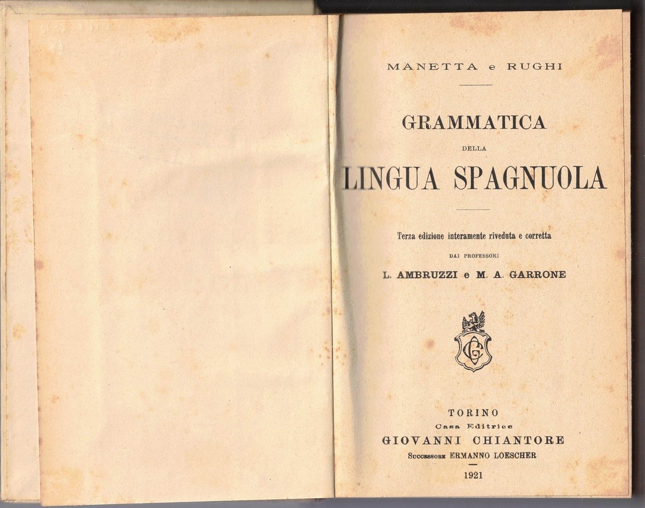 Filippo Manetta, Edoardo Rughi, Grammatica della lingua spagnuola, Casa Editrice Giovanni Chiantore Successore Ermanno Loescher, Torino 1921, terza ed. interamente riveduta e corretta dai professori L. Ambruzzi e M. A. Garrone, pp. XVI, 417, cm 19, legatura in tutta tela con titoli e fregi al dorso e titoli al piatto. Timbro d’appartenenza alla prima carta di guardia e alla carta successiva al frontespizio. Qualche sporadico segnetto di lapis, piccole abrasioni alle coste del dorso, minime fioriture, lieve brunitura della carta, per il resto esemplare ben conservato, con legatura solida e interno ben tenuto.