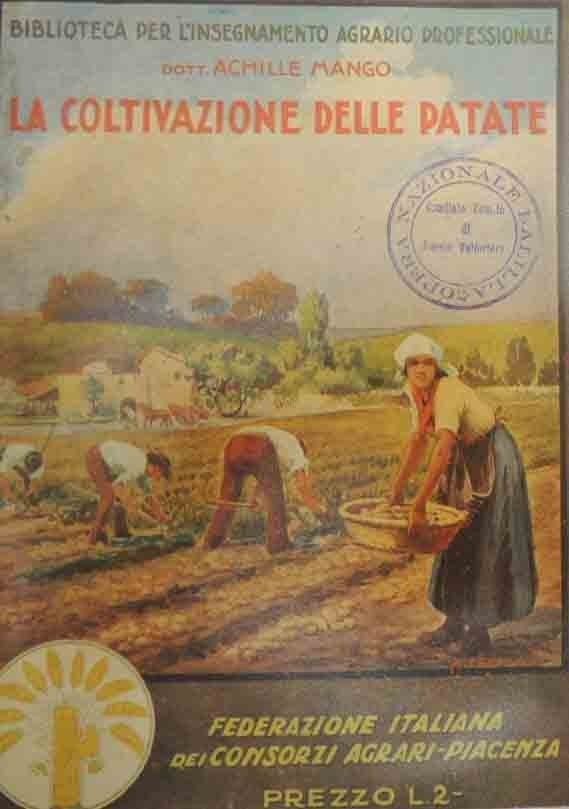 Achille Mango, La coltivazione delle patate e le esigenze dell’esportazione, Federazione Italiana dei Consorzi Agrari, Piacenza 1931, pp. 57, ill. b.n., cm 21, opuscolo spillato. Collana Biblioteca per l’insegnamento agrario professionale. Alla prima di copertina: timbro “Opera Nazionale Balilla - Comitato Com.le di Roseto Valfortore”. Lievissime fioriture a copertina e tagli, per il resto ben conservato.
