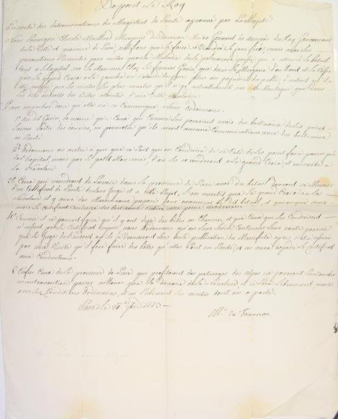 1773. 48.5 x 37 cm - Manuscrit sur papier vergé. Diverses déchirures avec petits manques sans manque de texte ; taches claires. Document très lisible. Précaution de confinement des bêtes malades (polmonera grava), surveillance et obligation de produire un certificat de santé lors du passage dans la région (Grand Croix où la maladie est déclarée, Moncenis, sur les routes de Savoie à Suse où doit se tenir une foire).