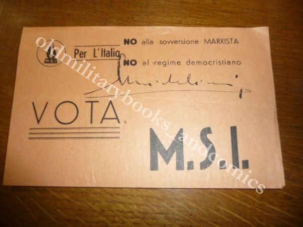 TITOLO: MANIFESTINO DI PROGANDA DEL M.S.I.: PER L'ITALIA NO ALLA SOVVERSIONE MARXISTA NO AL REGIME DEMOCRATICO DESCRIZIONE: S.d. foglio unico non scritto al retro in 16°. Dimensioni 18x11 cm. CONDIZIONI: Ottime segni di pieghette. PESO / WEIGHT: 5 gr. without package