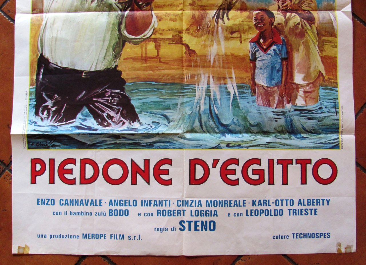 Bud Spencer e Enzo Cannavale in Piedone d'Egitto. Titanus, I edizione 1980. Manifesto 1 Foglio 100x140 con tracce di vecchio scotch ai 4 angoli e due piccoli taglietti al margine destro (come da foto). Raro e in Buonissimo stato. , Molto buono (Very Good)